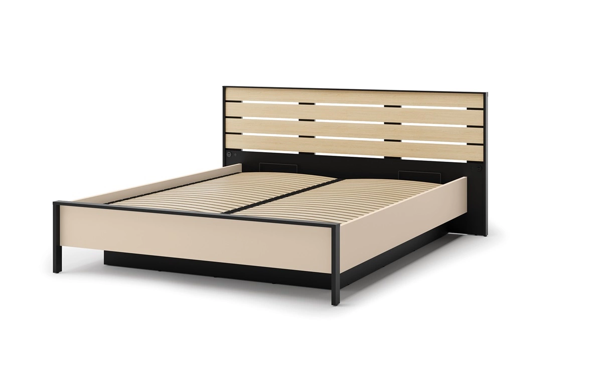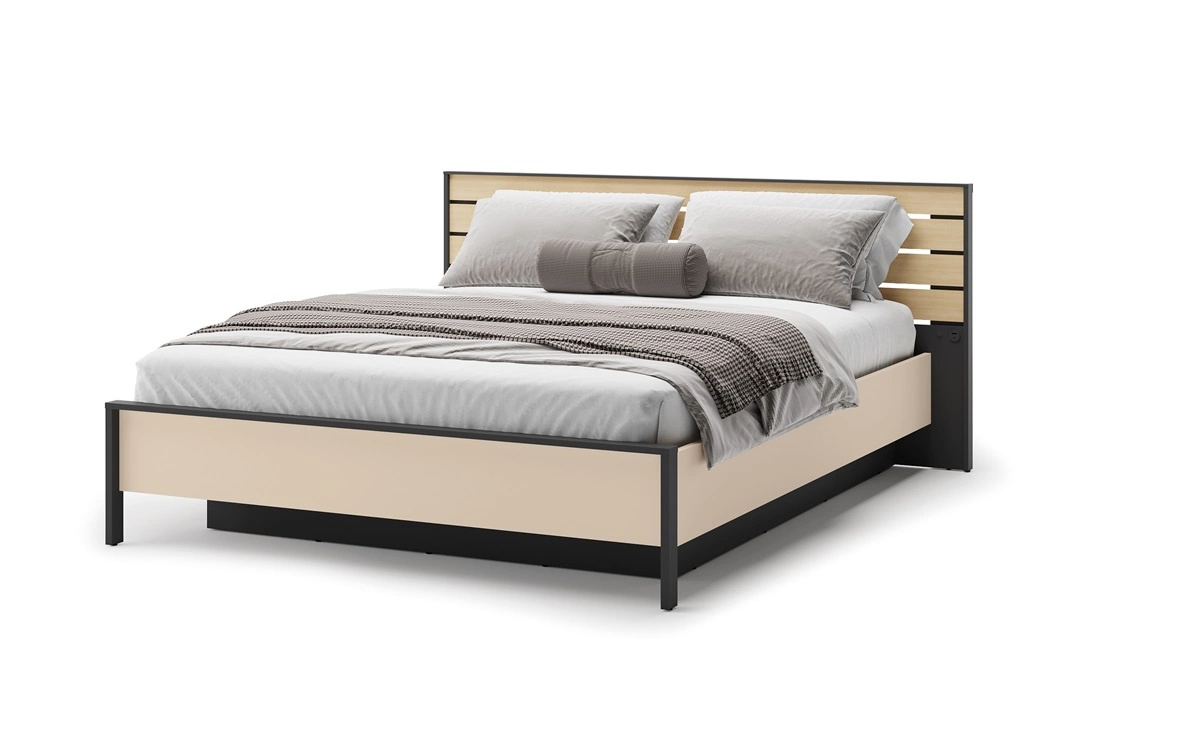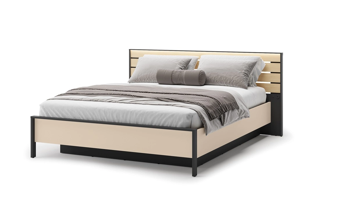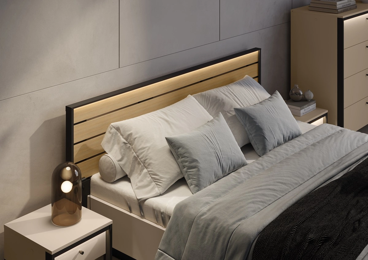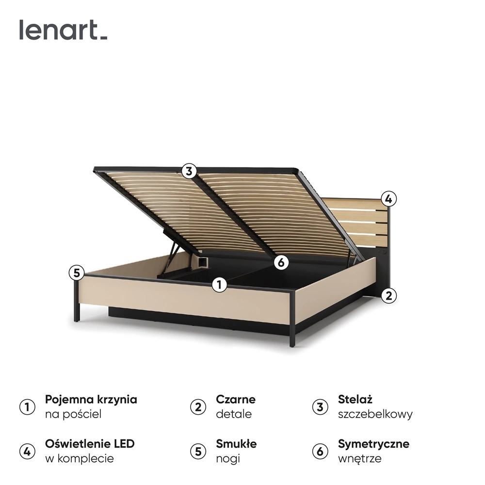 - Łóżko z pojemnikiem Enna przyciąga uwagę swoim wyglądem i funkcjonalnością. Subtelne oświetlenie LED umieszczone w zagłówku przykuwa uwagę i stanowi elegancką ozdobę. Połączenie beżu z dębowym dekorem i czarnymi dodatkami podkreślą nowoczesność łóżka.