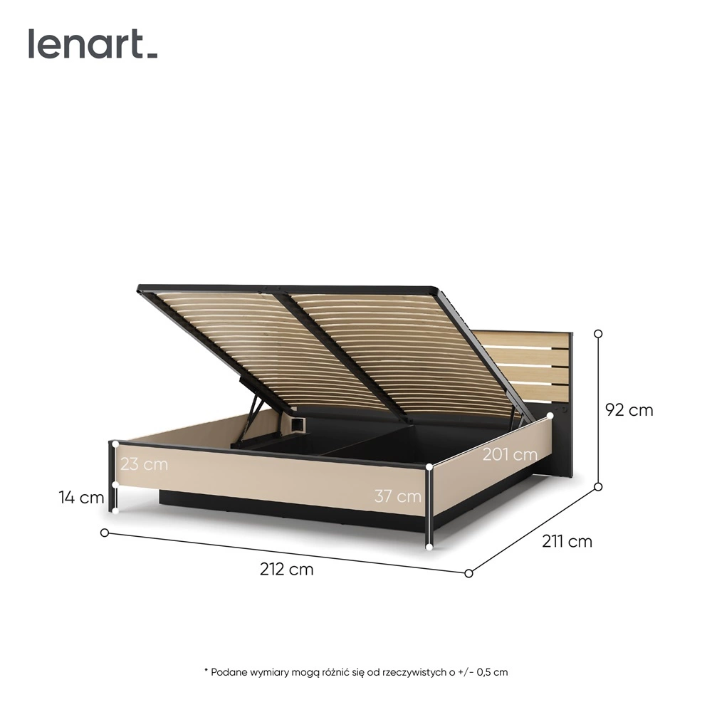 Łóżko Enna 180x200 cm beżowy / czarny / dąb natura wygodne łóżko z pojemnikiem na pościel wysoki zagłówek z oświetleniem LED