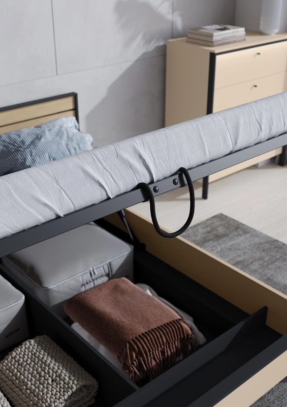 Łóżka do sypialni z kolekcji Enna wyposażone są w stabilny, metalowy stelaż pod materac. Łatwe i lekkie otwieranie ramy z materacem zapewniają podnośniki gazowe. Łóżko Enna gwarantuje komfortowe i bezproblemowe korzystanie oraz trwałość całego mebla przez wiele lat użytkowania. Połączenie subtelnego beżu z czarnymi dodatkami sprawia, że łóżko z pojemnikiem świetnie sprawdzi się jako łóżko do sypialni lub łóżko młodzieżowe w pokoju nastolatka.
