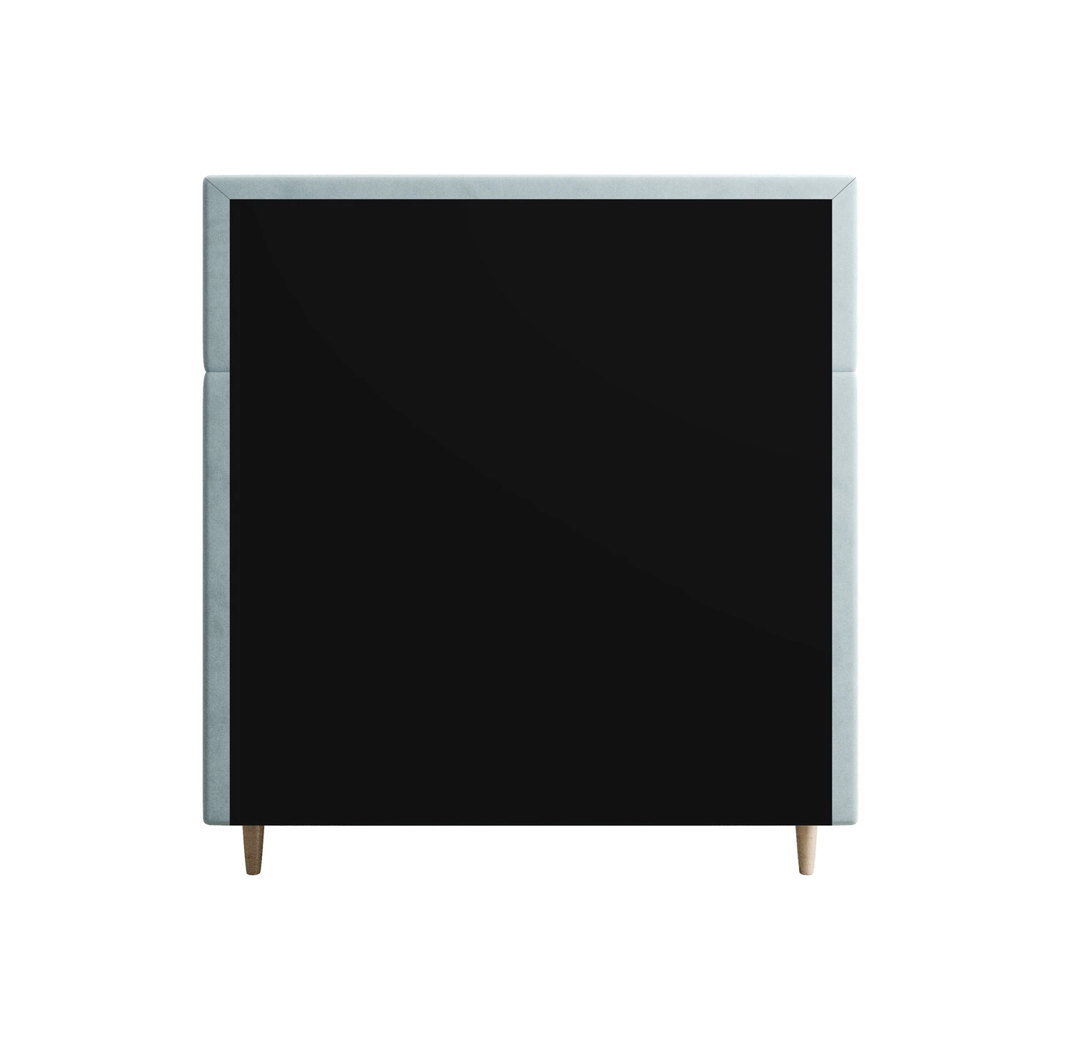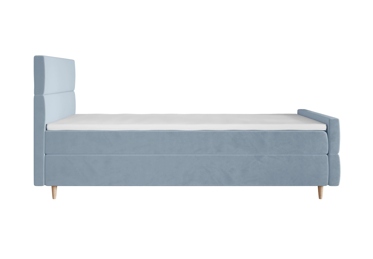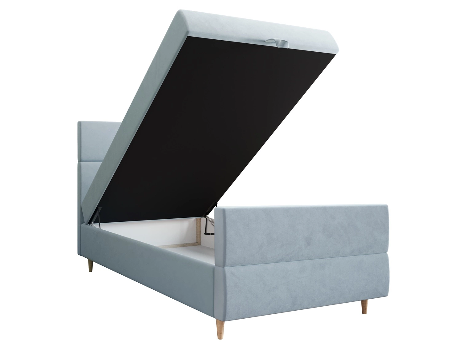Łóżko kontynentalne Benet 100x200 błękitne w nowoczesnym skandynawskim stylu z tapicerowanym zagłówkiem oraz zanóżkiem łóżko z pojemnikiem