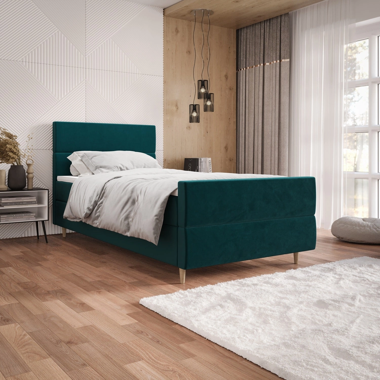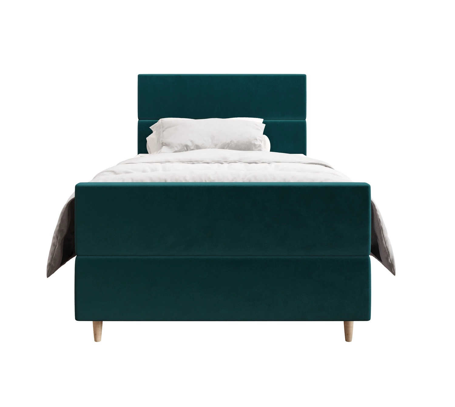 Łóżko kontynentalne Benet 100x200 turkusowe w nowoczesnym skandynawskim stylu z tapicerowanym zagłówkiem oraz zanóżkiem łóżko z pojemnikiem