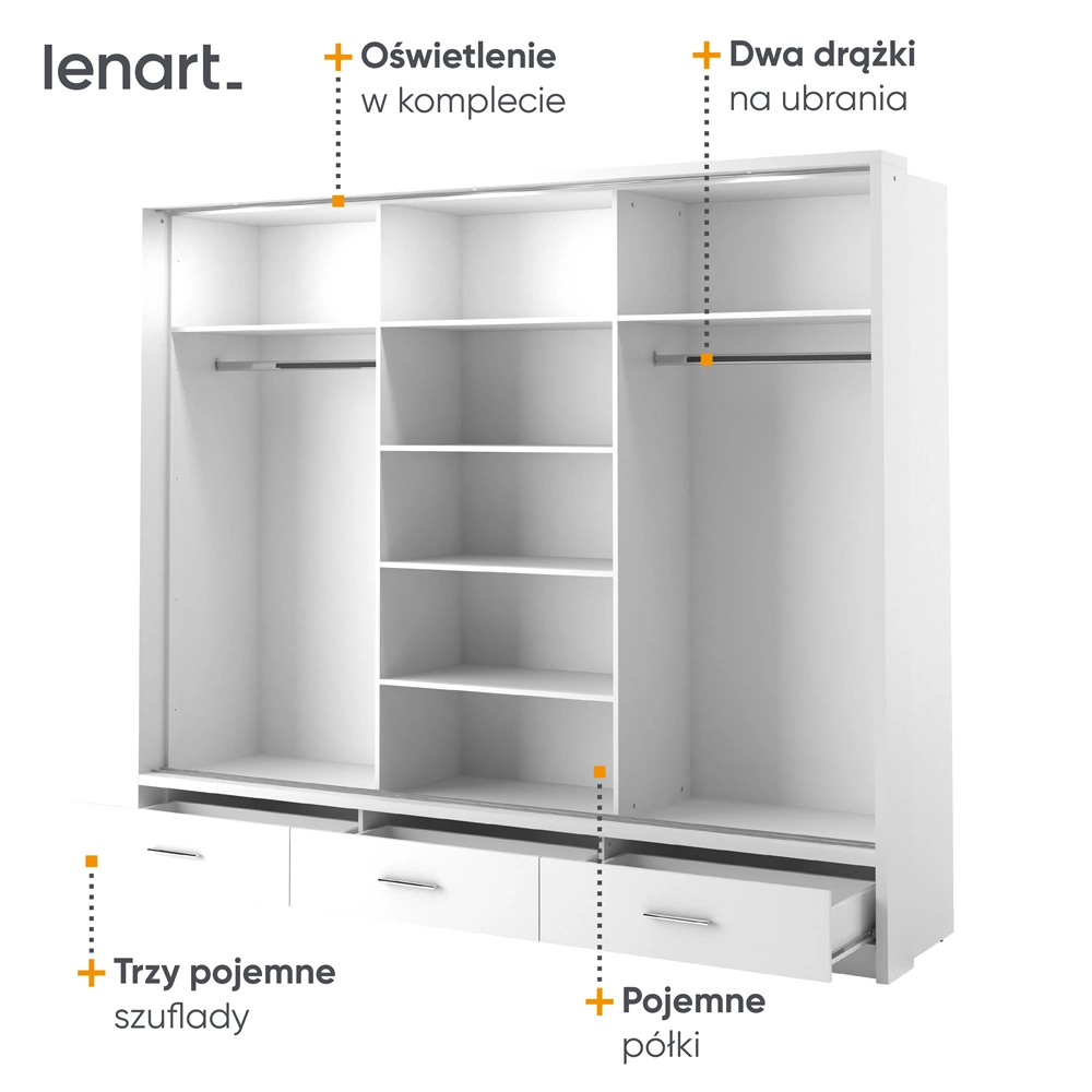 Szafa przesuwna z lustrem Arti 250 cm biała funkcjonalna szafa do przedpokoju z szufladami duże lustra podkreśla oświetlenie LED