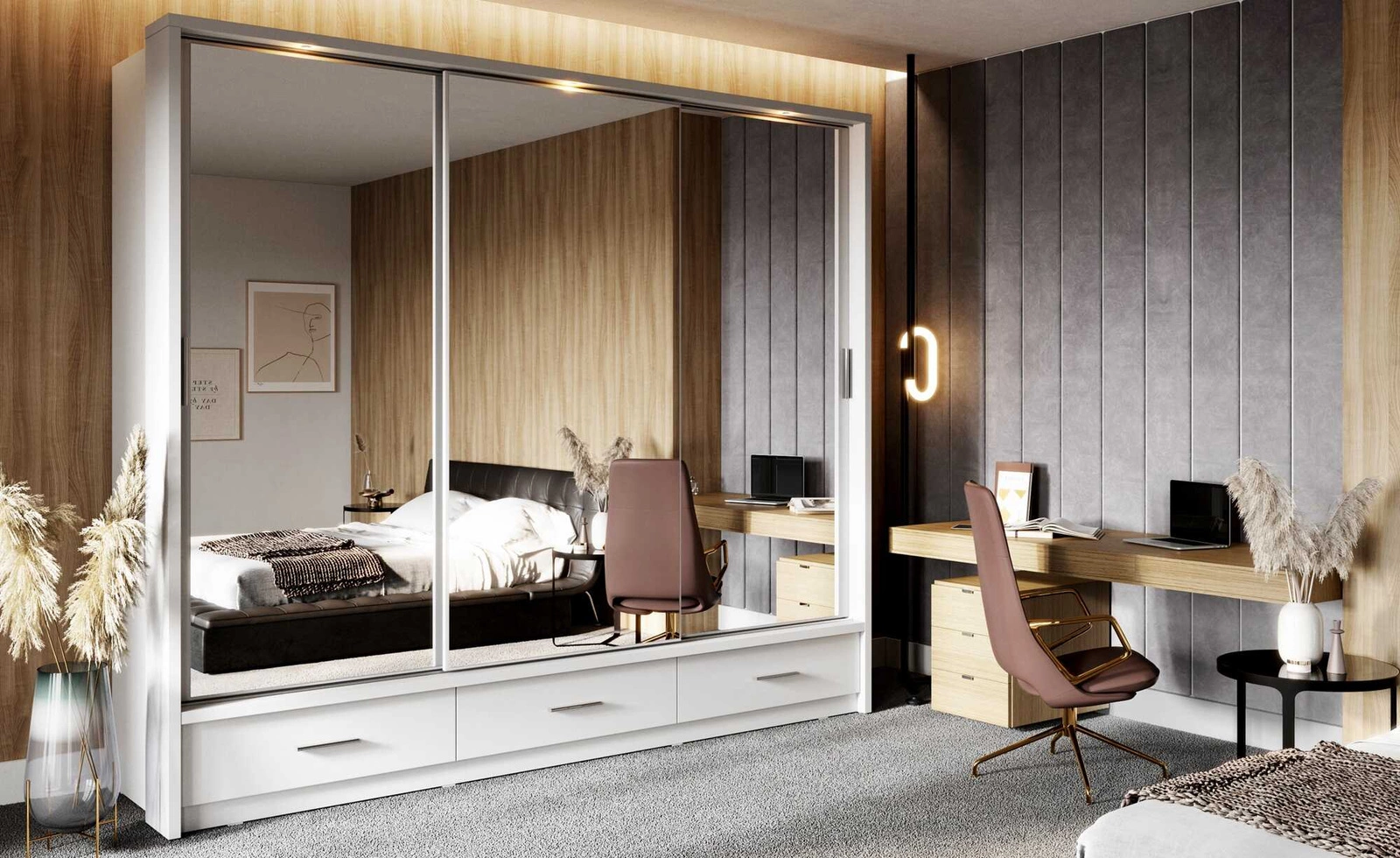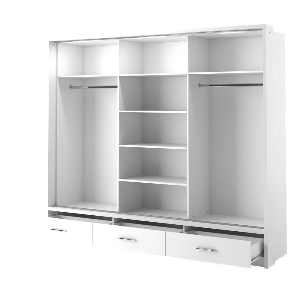 Wnętrze szafy Arti wyposażone jest w dwa drążki na ubrania wiszące i półki. Wszystkie drzwi szafy zostały wykończone dużymi lustrami. Pojemne szuflady pomieszczą wszystkie drobiazgi oraz niezbędne akcesoria. Szafy do sypialni z kolekcji Arti wykonane są z wysokiej jakości płyty laminowanej, która charakteryzuje się odpornością na wpływ czynników zewnętrznych takich jak obicia, uderzenia i niefortunne zadrapania. Stylowym wykończeniem drzwi szafy są srebrne uchwyty, które poza swoją podstawową funkcją, nadają niezwykle gustownego wyglądu. Szafa wyposażona jest w subtelne oświetlenie LED, dzięki czemu bryła zyskuje wizualną lekkość.