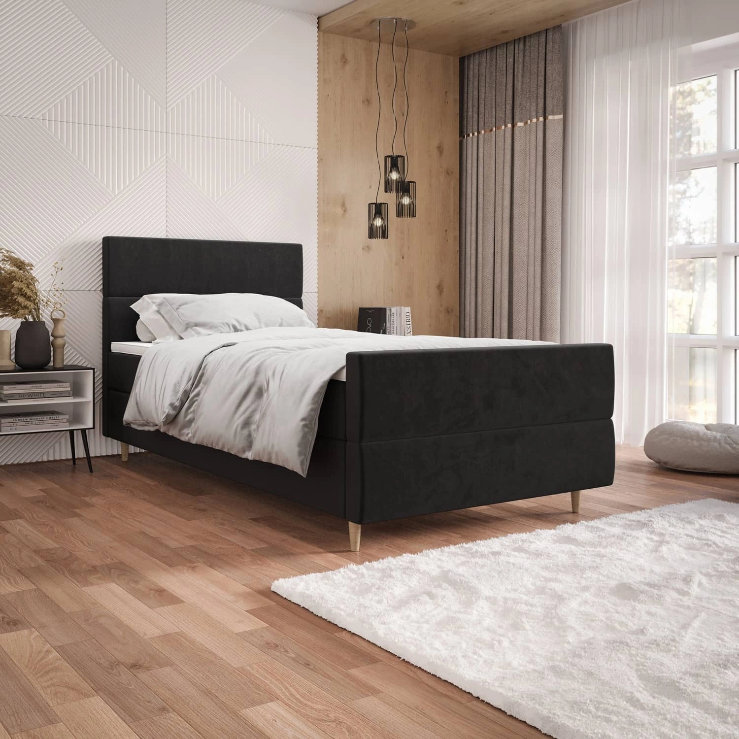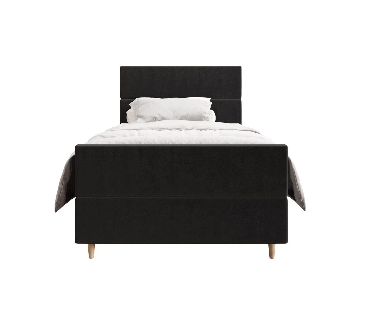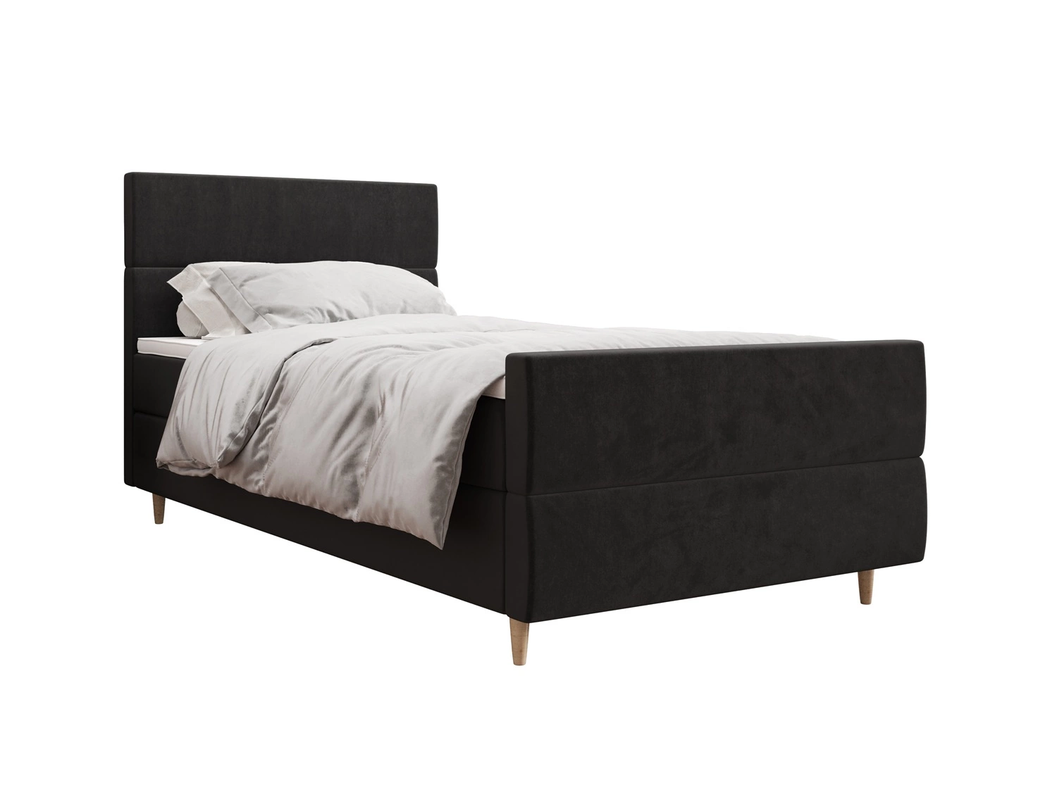 Łóżko kontynentalne Benet 120x200 grafitowe w nowoczesnym skandynawskim stylu z tapicerowanym zagłówkiem oraz zanóżkiem łóżko z pojemnikiem