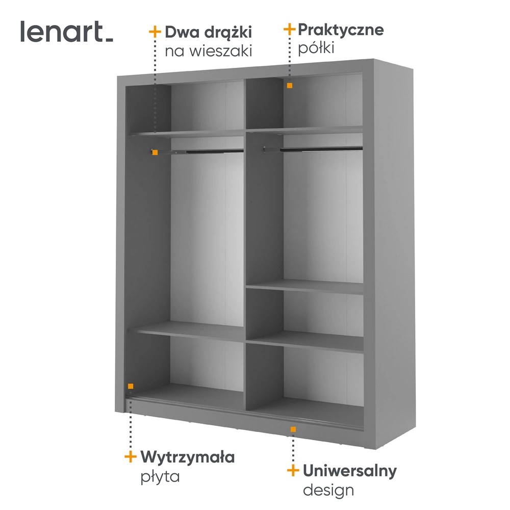 Szafa jest skonstruowana z 2 drzwi. Szafa gwarantuje komfortowe i bezproblemowe korzystanie oraz trwałość całego mebla przez wiele lat użytkowania. Prosty design sprawia, że szafa na ubrania z powodzeniem sprawdzi się jako szafa z lustrem do sypialni, jako szafa do przedpokoju lub szafa do pokoju dziecięcego. Szafa przesuwna Arti będzie również świetnym wyborem do pokoju niemowlęcego. Doskonale sprawdzi się także w roli garderoby do przedpokoju.