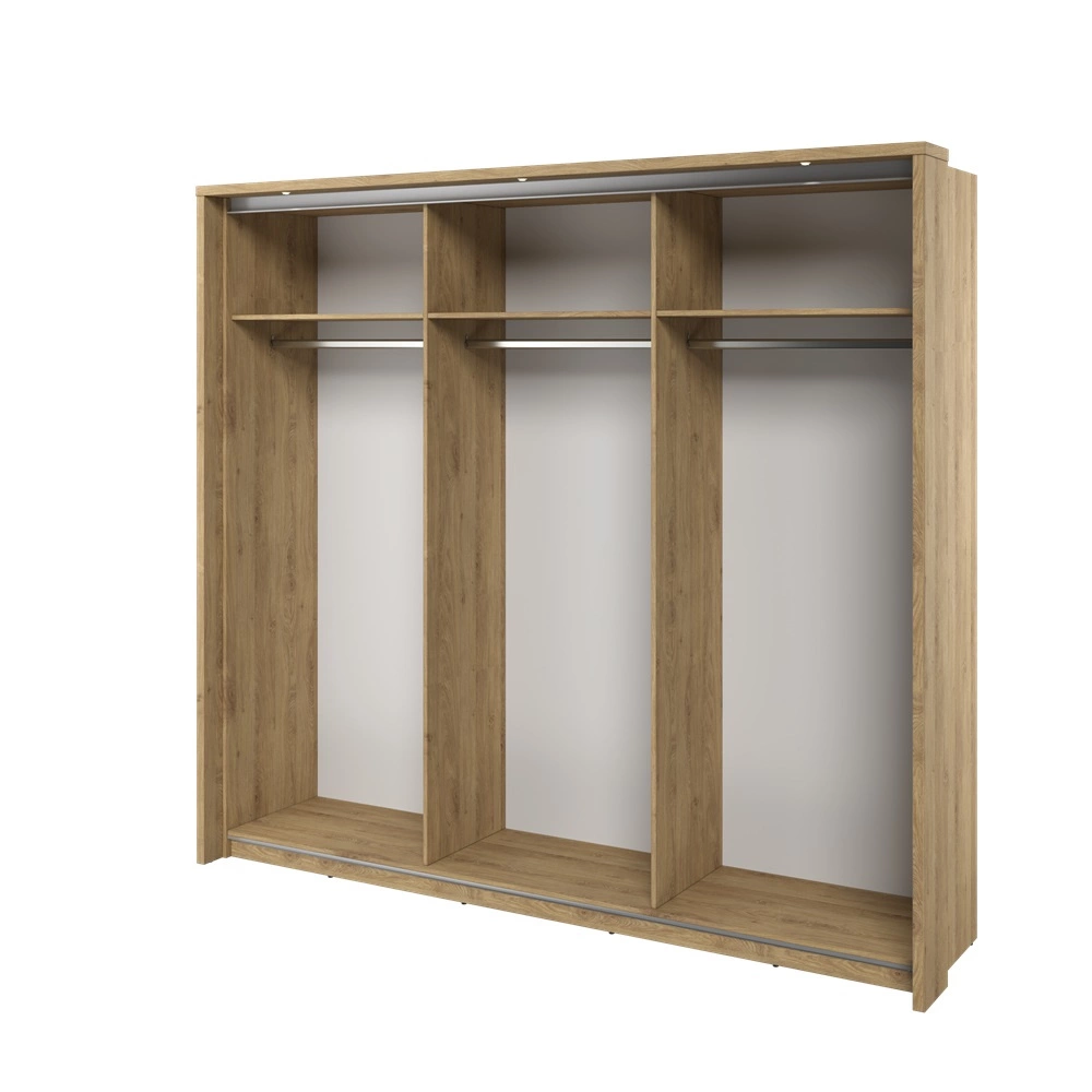 Wnętrze szafy Arti wyposażone jest w trzy drążki na ubrania wiszące i półki. Na frontach znajduje się tafla luster, która optycznie powiększa wnętrze, wprowadza do pomieszczenia więcej światła oraz dobrze wpływa na komfort używania mebla. Szafy do sypialni z kolekcji Arti wykonane są z wysokiej jakości płyty laminowanej, która charakteryzuje się odpornością na wpływ czynników zewnętrznych takich jak obicia, uderzenia i niefortunne zadrapania. Szafa wyposażona jest w subtelne oświetlenie LED, dzięki czemu bryła zyskuje wizualną lekkość.