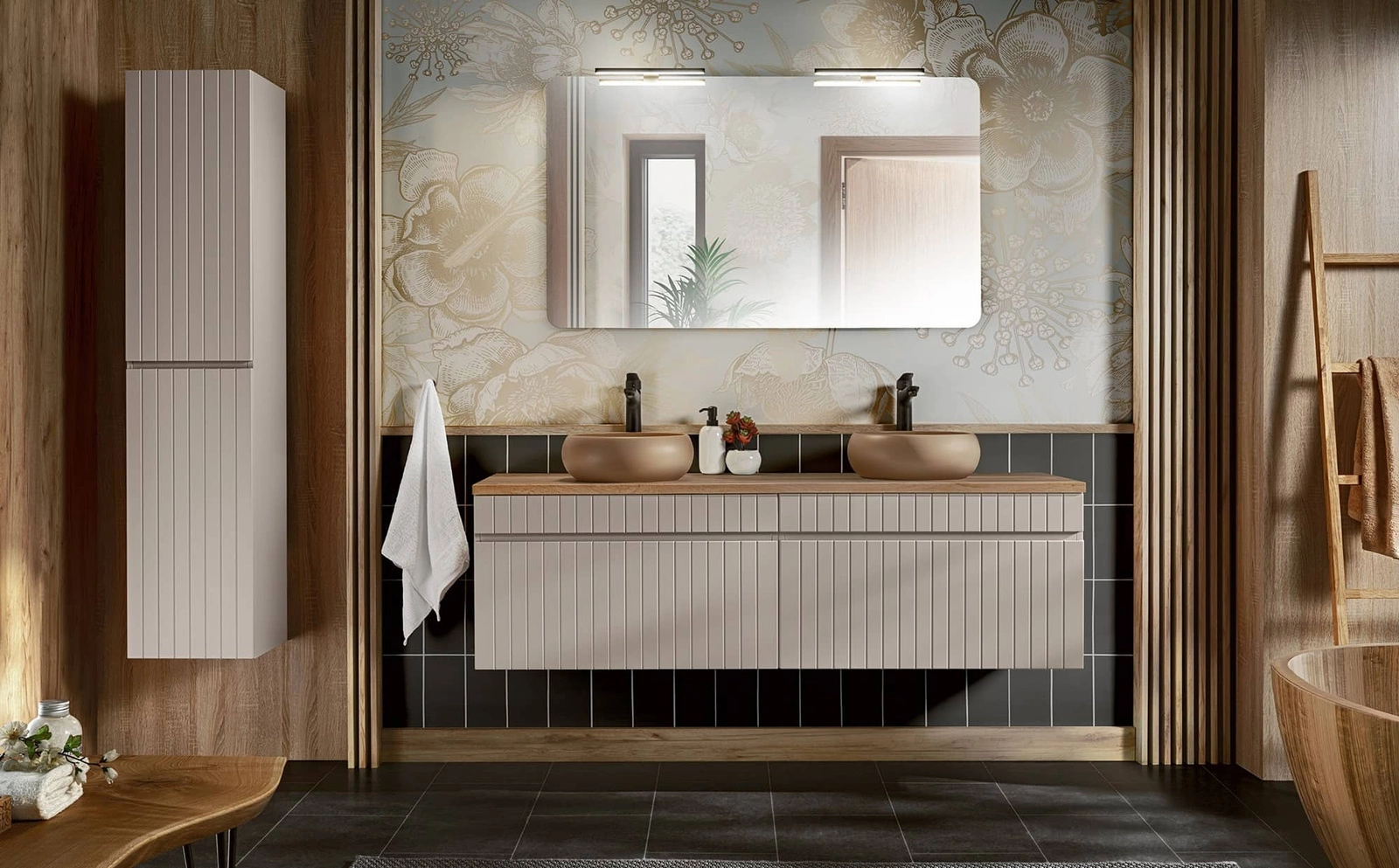 Słupek łazienkowy wiszący Iconic 35 cm beżowy szafka odporna na działanie wilgoci i wysokiej temperatury gustowne pionowe ryflowanie