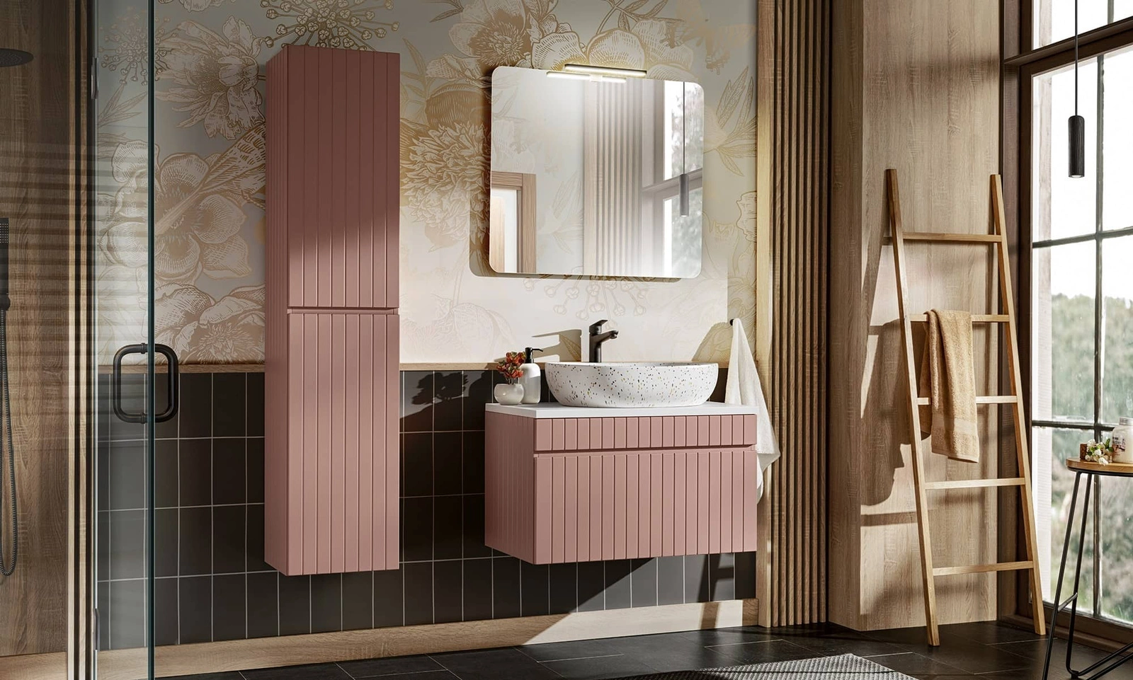 Szafka pod umywalkę Iconic 80 cm antyczna róża designerska szafka z gustownym pionowym ryflowaniem pojemna szuflada na akcesoria