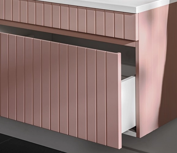 Szafka pod umywalkę Iconic to niezwykle trwały mebel łazienkowy, który łączy wysoką elegancję i funkcjonalność. Elementem wyróżniającym meble z kolekcji Iconic są ozdobne pionowe ryflowania na korpusie oraz frontach, które nadają meblom unikalnego charakteru, dodatkowo optycznie powiększając przestrzeń łazienki. Wyjątkowa kolorystyka w odcieniach subtelnego różu dodaje lekkości, doskonale komponując się z różnorodnymi aranżacjami wnętrz.
