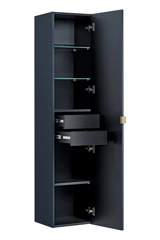 Meble do łazienki Santa Fe to niezwykle trwałe meble łazienkowe, które łączą wysoką elegancję i funkcjonalność. Głęboki granat połączony z ryflowanymi frontami nadaje całości nietuzinkowego charakteru, dzięki czemu wygląd kolekcji sprosta nawet najbardziej wysublimowanym potrzebom wizualnym. Dopełnieniem frontów mebli do łazienki są metalowe uchwyty krawędziowe w kolorze złotym, doskonale wpisujące się w obecne trendy. Luksusowy design i odważna kolorystyka z pewnością ożywi każdą łazienkę oraz zachwyci elegancją.