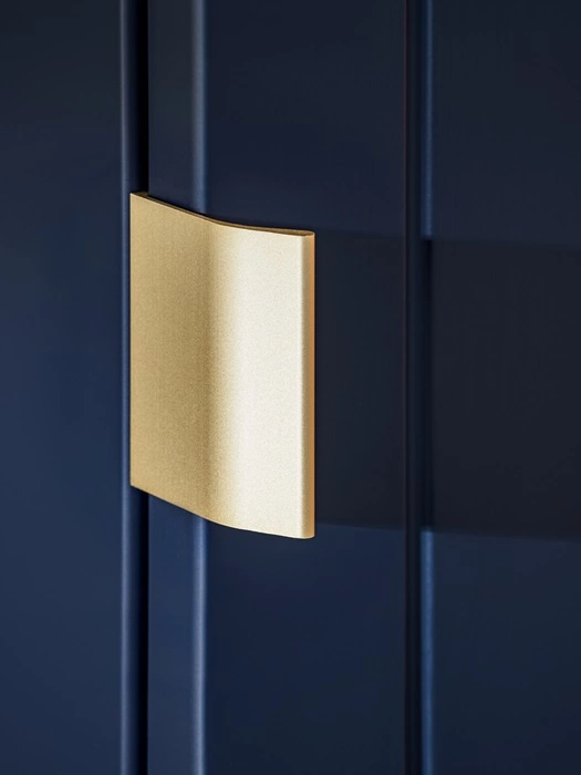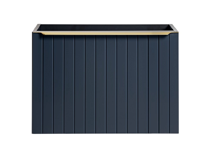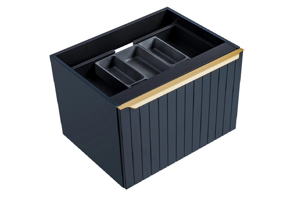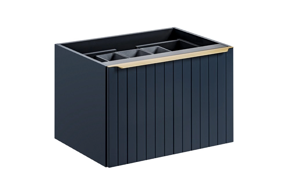 - Zestaw mebli łazienkowych Santa Fe to odważny projekt, w którym głęboki granatowy kolor został połączony z ryflowanymi frontami, co nadaje całości nietuzinkowego charakteru. Dopełnieniem są złote uchwyty, doskonale wpisujące się w obecne trendy.