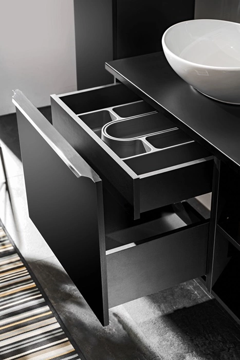 Standardowym wyposażeniem szafki jest funkcjonalny, perfekcyjnie dopasowany organizer do szuflady. Korpus szafki jest wykonany z wysokiej jakości płyty laminowanej o grubości 16 mm. Zaletą tego rodzaju płyty jest wysoka odporność na wpływ czynników, często występujących w łazience, takich jak para wodna, wysoka temperatura czy rozlane ciecze. Fronty szafki pod umywalkę zostały wykonane z płyty MDF. Konstrukcja szafki umożliwia zabudowanie jej dedykowanym blatem oraz użycie tylko umywalki natlatowej.