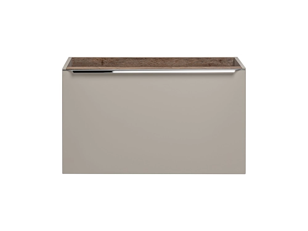 Standardowym wyposażeniem szafki jest funkcjonalny, perfekcyjnie dopasowany organizer do szuflady. Korpus szafki jest wykonany z wysokiej jakości płyty laminowanej o grubości 16 mm. Zaletą tego rodzaju płyty jest wysoka odporność na wpływ czynników, często występujących w łazience, takich jak para wodna, wysoka temperatura czy rozlane ciecze. Fronty szafki pod umywalkę zostały wykonane z płyty MDF. Konstrukcja szafki umożliwia zabudowanie jej dedykowanym blatem oraz użycie tylko umywalki natlatowej.