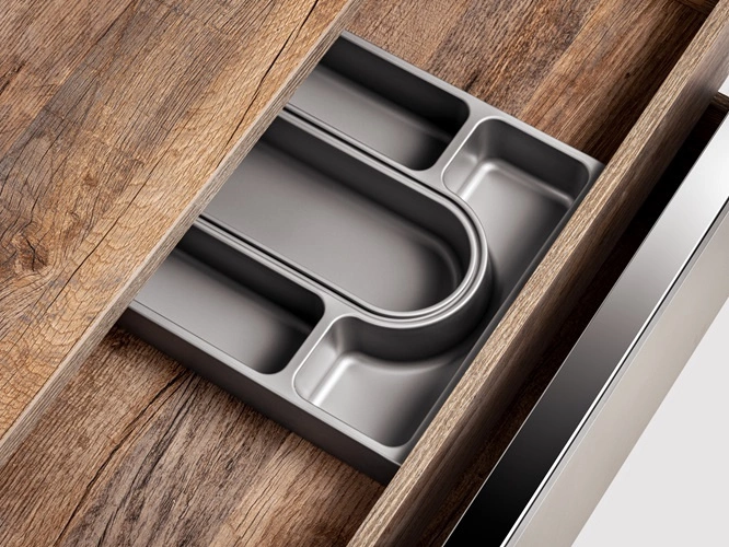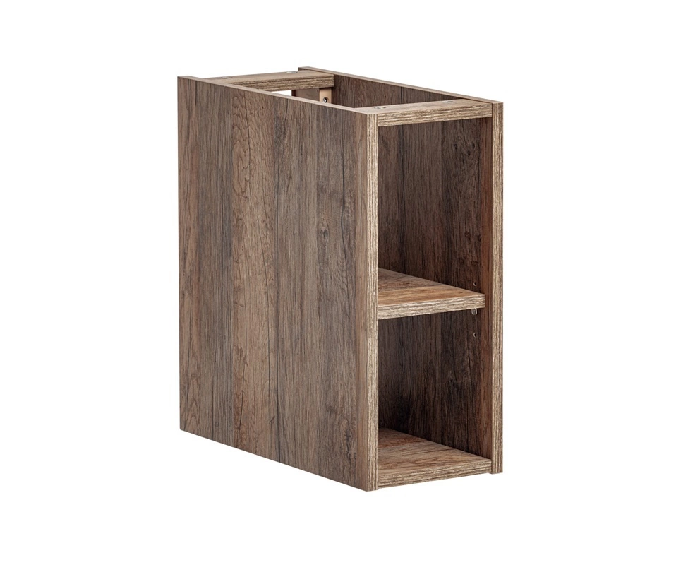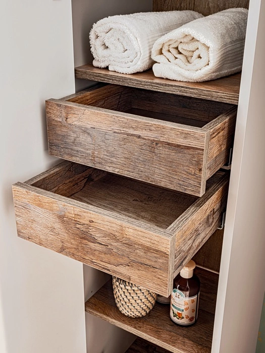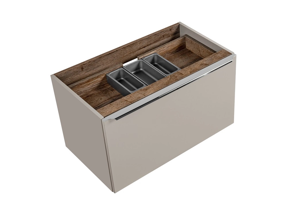 Standardowym wyposażeniem szafki pod umywalkę jest funkcjonalny, perfekcyjnie dopasowany organizer do szuflady. We wnętrzu słupka łazienkowego znajdują się dwie szuflady z systemem pełnego wysuwu. Korpusy szafek są wykonane z wysokiej jakości płyty laminowanej o grubości 16 mm. Zaletą tego rodzaju płyty jest wysoka odporność na wpływ czynników, często występujących w łazience, takich jak para wodna, wysoka temperatura czy rozlane ciecze. Fronty szafek do łazienki zostały wykonane z płyty MDF. Blat do szafki łazienkowej został wykonany z płyty laminowanej o grubości 25mm. Jego powierzchnia jest łatwa do czyszczenia i utrzymania w doskonałym stanie.