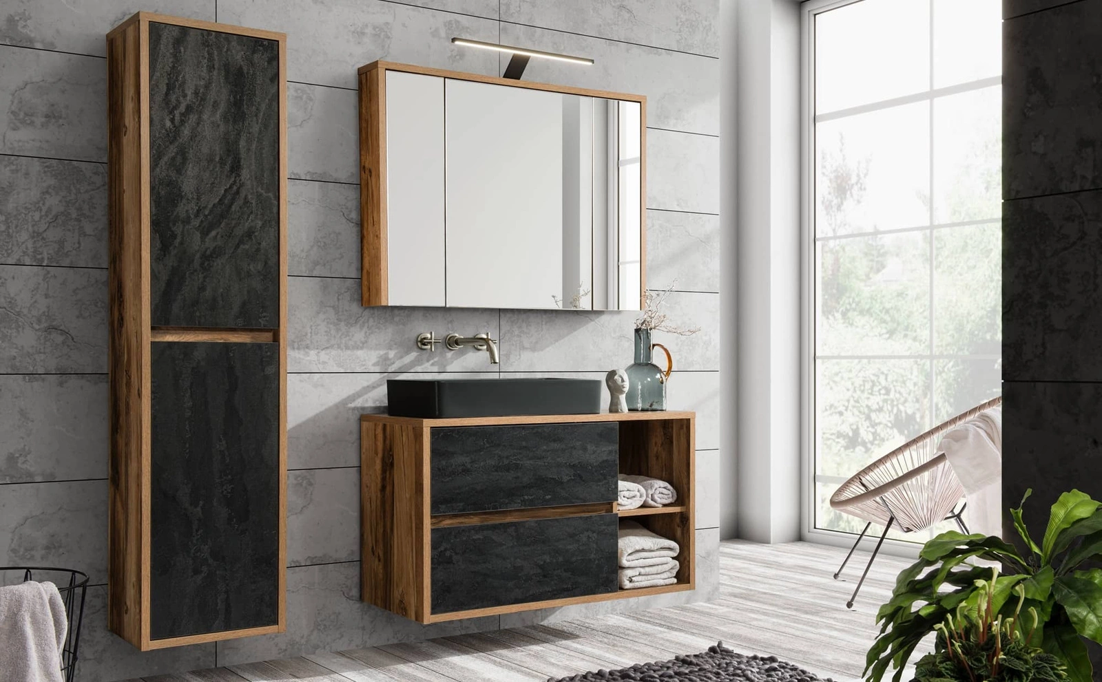 Szafka pod umywalkę Hampton 100 cm w kolorze dąb huton / ciemny beton to doskonałe dopełnienie każdej łazienki.