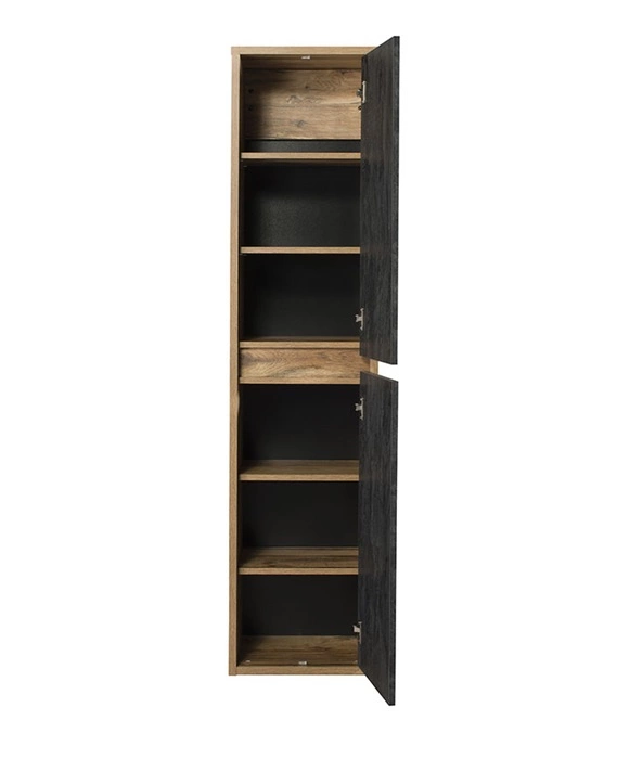 • Słupek łazienkowy Hampton to połączenie prostej i stonowanej formy z imitującym drewno dekorem dąb huton, pozwalające stworzyć harmonijne i wyjątkowe wnętrze. Całości dopełniają otwarte półki i fronty szafki w kolorze ciemny beton.