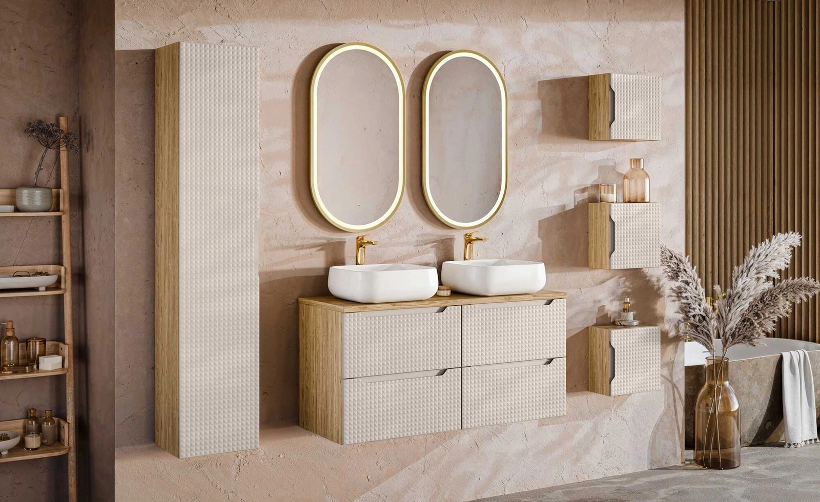 Szafka pod umywalkę z kolekcji Luxor łączy w sobie nowoczesny design, trwałość oraz solidność. Oryginalne trójwymiarowe frezowania tworzą wyrafinowaną ozdobą każdej łazienki oraz świetnie prezentują się w towarzystwie modnego beżowego wybarwienia. Całości dopełnia korpus szafki w naturalnym dębowym odcieniu, nadając lekkości i ciepła aranżacji, dodatkowo podkreślając wyrafinowany styl kolekcji Luxor. Dodatkowym atutem szafki do łazienki są niezwykle oryginalne frezowane uchwyty, które poza swoją podstawową funkcją dodają meblom efektownego wyglądu.
