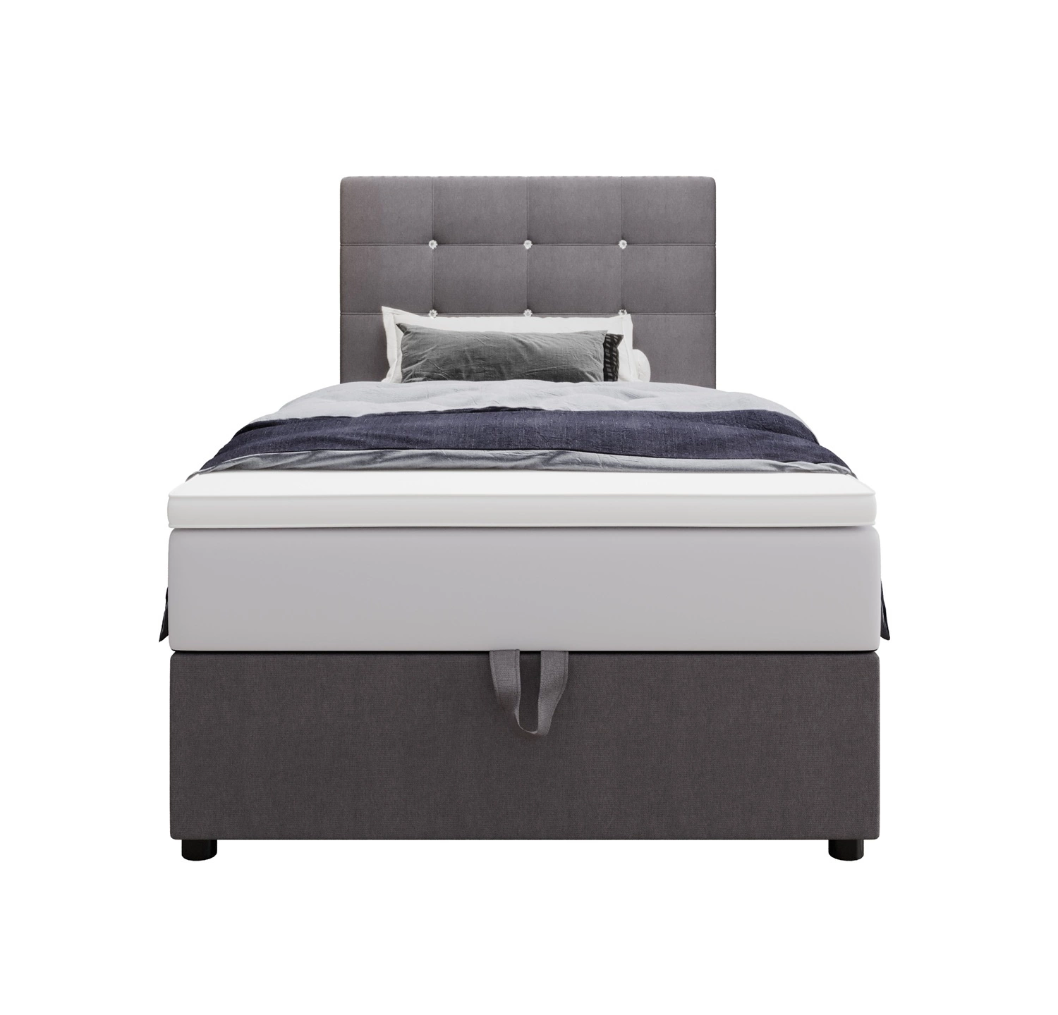 Łóżko kontynentalne Kingston 90x200 szare w nowoczesnym skandynawskim stylu z tapicerowanym zagłówkiem z kryształkami łóżko z pojemnikiem