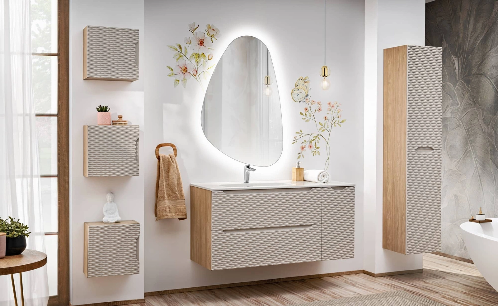 Szafka pod umywalkę z kolekcji Ocean łączy w sobie nowoczesny design, trwałość oraz solidność. Oryginalne frezowania w kształcie poziomych fal tworzą designerską ozdobą każdej łazienki oraz świetnie prezentują się w towarzystwie modnego beżowego wybarwienia. Całości dopełnia korpus szafki w naturalnym dębowym odcieniu, nadając lekkości i ciepła aranżacji, dodatkowo podkreślając wyrafinowany styl kolekcji Ocean. Dodatkowym atutem szafki do łazienki są niezwykle oryginalne frezowane uchwyty, które poza swoją podstawową funkcją dodają meblom efektownego wyglądu.