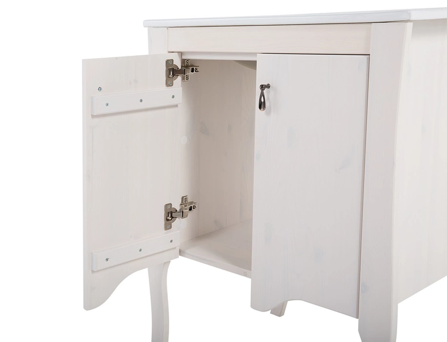 Szafka pod umywalkę Elisabeth zachwyci najbardziej wymagających miłośników eleganckiego stylu. Stylowe wygięte nóżki, biel frontów z delikatnie prześwitującą strukturą drewna oraz kontrastowe uchwyty wykonane z metalu podkreślą bogaty wystrój każdej łazienki. Meble łazienkowe z kolekcji Elizabeth zostały wykonane z drewna, co uwydatnia ich naturalny wygląd i ociepla wnętrze. Szafka pod umywalkę została zaprojektowana w sposób funkcjonalny i użytkowy, oferując dużo miejsca do przechowywania.