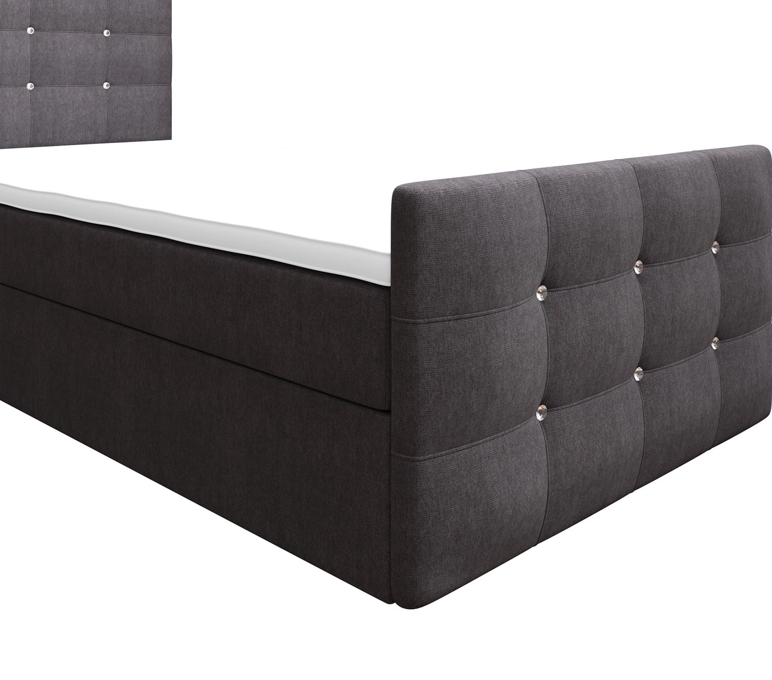 Łóżko wykonane z tkaniny typu welur Cosmic 97 gwarantuje najwyższy komfort i funkcjonalność podczas codziennego wypoczynku w sypialni. Tkanina posiada powłokę hydrofobową, co gwarantuje ograniczone wchłanianie cieczy. Dzięki wszystkim właściwościom użytej tkaniny, łóżko kontynentalne na długo zachowa swój pierwotny wygląd. Konstrukcja łóżka zapewnia dużą stabilność i wygodę użytkowania. Rama łóżka kontynentalnego jest wykonana z drewna oraz płyty meblowej. Pikowane wezgłowie oraz zanóżek, które dodatkowo są wykończone guzikami w kształcie kryształków, przyciągają wzrok i nadają łóżku szczególnego charakteru.