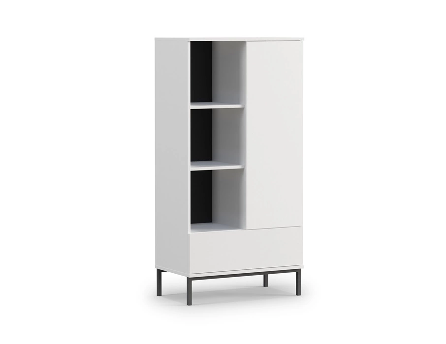 Regał jest skonstruowany z 1 drzwi, 1 szuflady oraz otwartych półek. Regał z szufladą Tutti został zaprojektowany w sposób funkcjonalny i użytkowy, oferując dużo miejsca do przechowywania. Ponadczasowa biel regału świetnie łączy się z innymi barwami, dzięki czemu regały na książki Tutti świetnie sprawdzą się jako regały do salonu regały do pokoju dziecięcego. Regały z półkami z powodzeniem odnajdą się także jako regały biurowe.