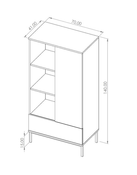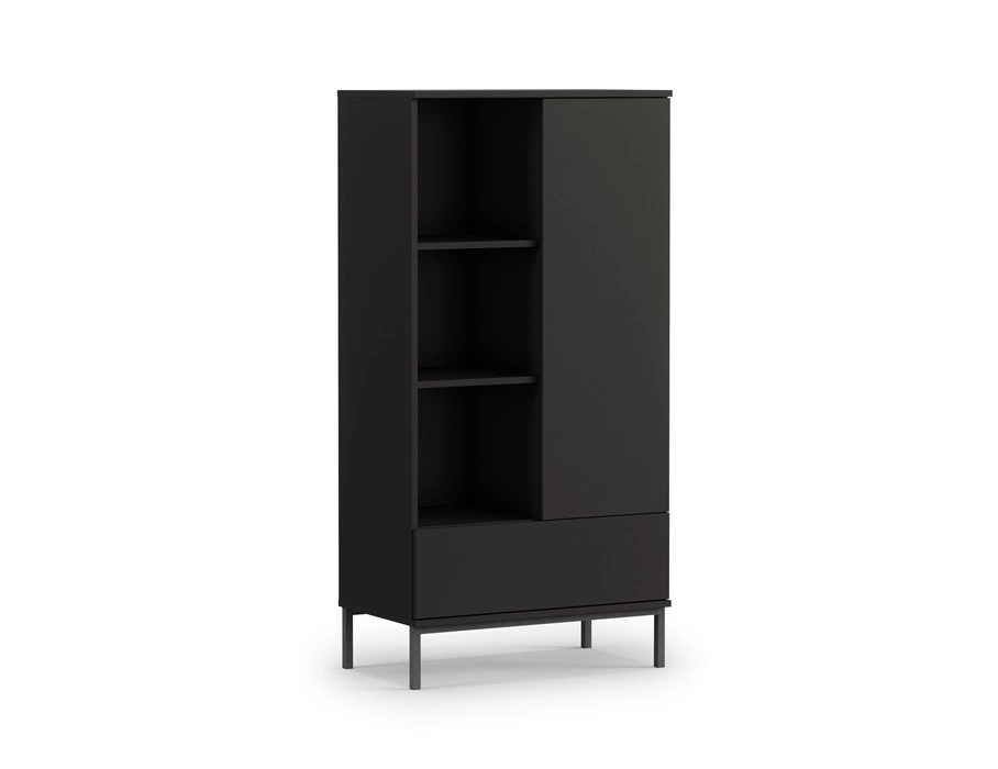 Regał jest skonstruowany z 1 drzwi, 1 szuflady oraz otwartych półek. Regał z szufladą Tutti został zaprojektowany w sposób funkcjonalny i użytkowy, oferując dużo miejsca do przechowywania. Ponadczasowa czerń regału świetnie łączy się z innymi barwami, dzięki czemu regały na książki Tutti świetnie sprawdzą się jako regały do salonu regały do pokoju dziecięcego. Regały z półkami z powodzeniem odnajdą się także jako regały biurowe.