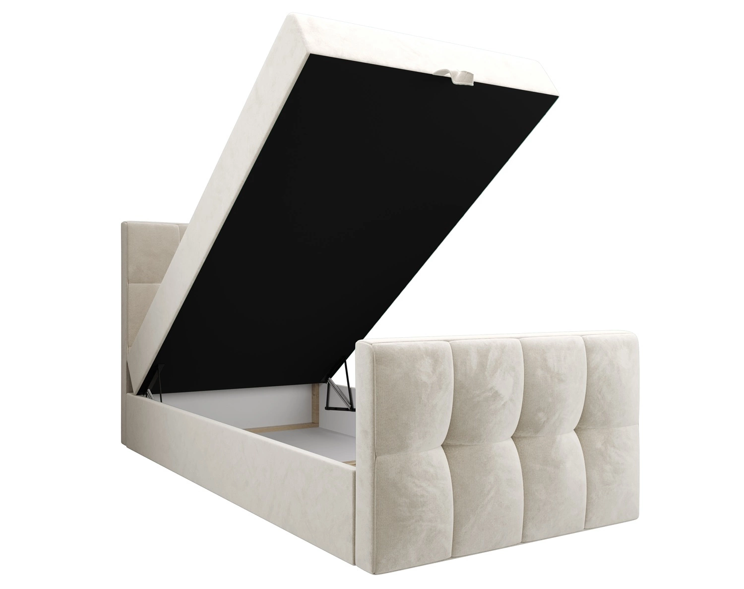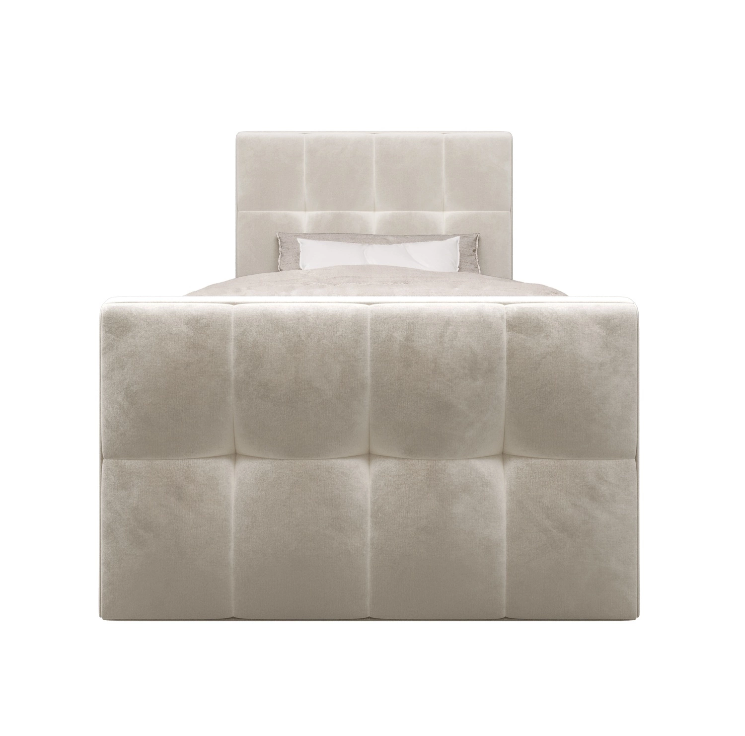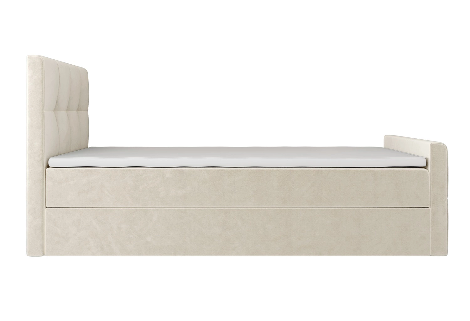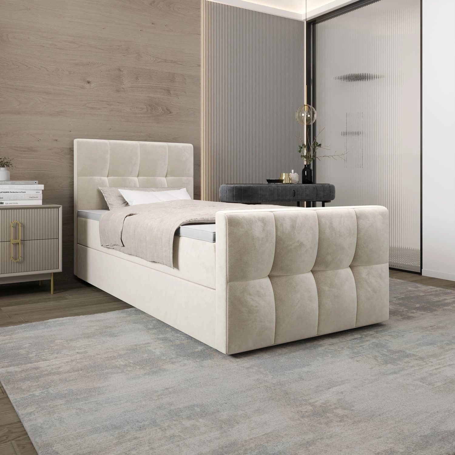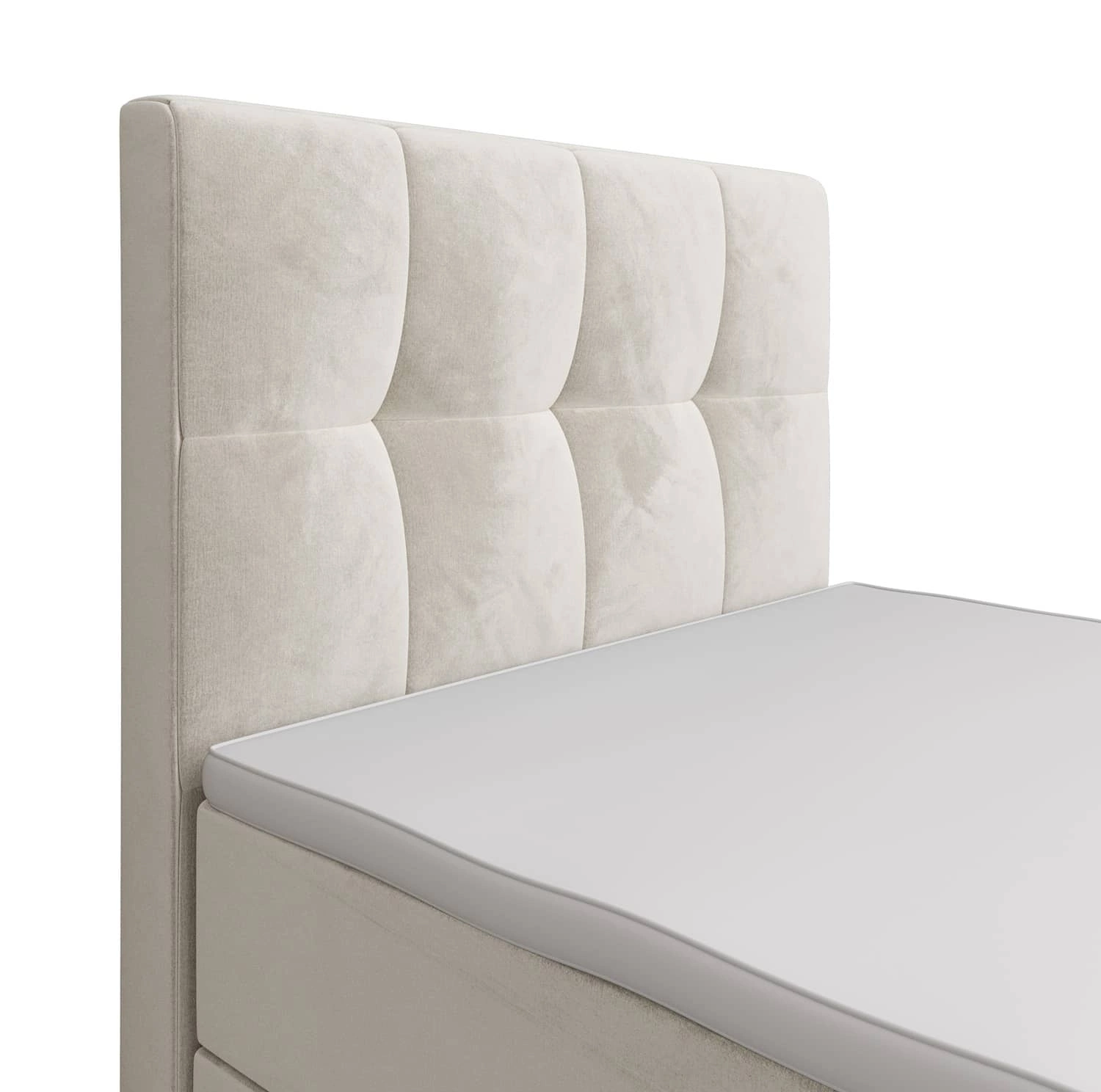 Łóżko kontynentalne Manhattan 90x200 beżowe w nowoczesnym skandynawskim stylu z tapicerowanym zagłówkiem i zanóżkiem łóżko z pojemnikiem