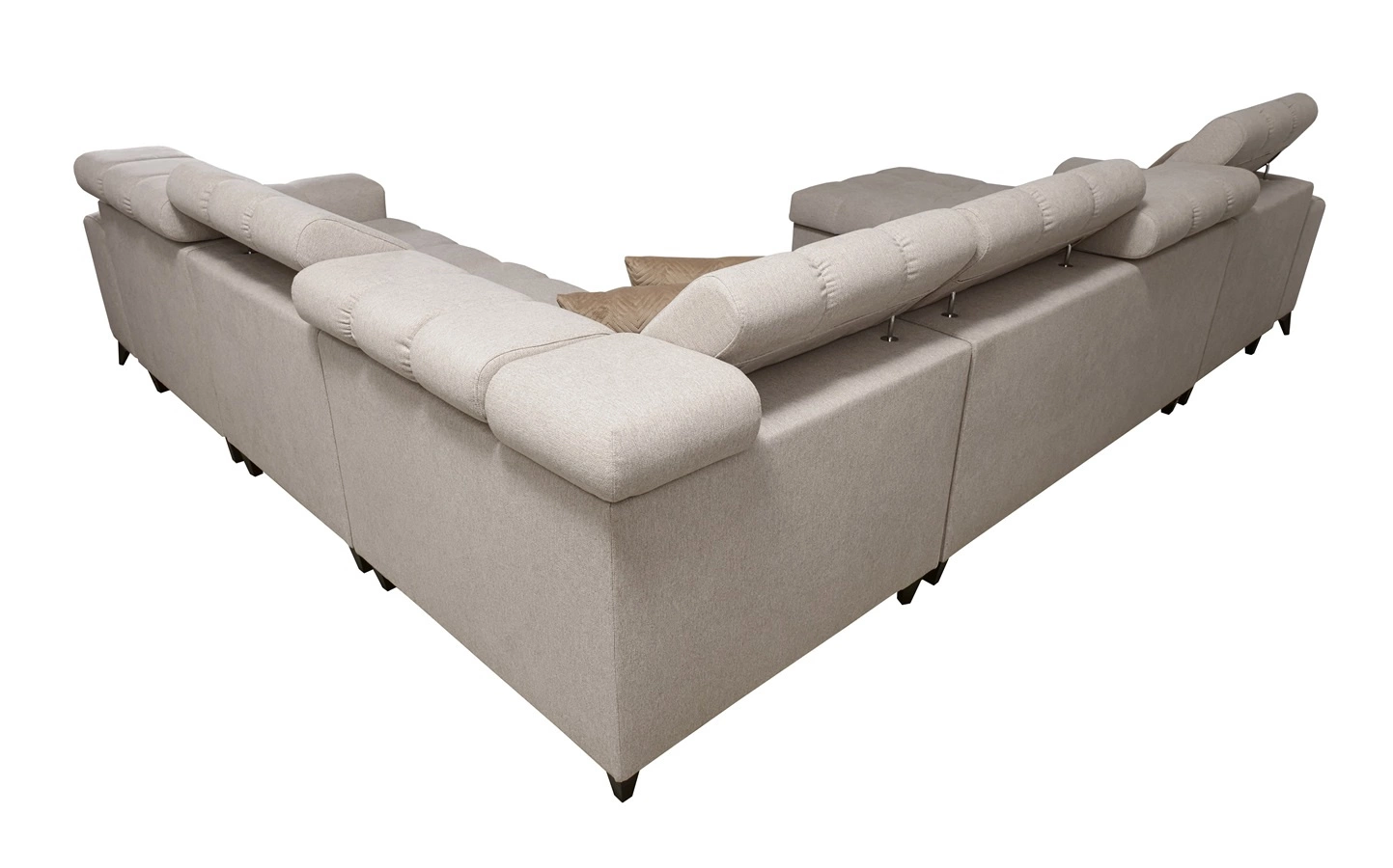 Wymiary mebla pozwolą na zapełnienie przestrzeni w przestronnym salonie lub pokoju dziennym. Szerokość narożnika 359 cm, wysokość maksymalna 100 cm oraz głębokość 276 cm. Powierzchnia spania narożnika wynosi 127x284 cm. Wysokość siedziska mebla to 45 cm a maksymalna wysokość oparcia wynosi 60 cm. Sprężyny faliste oraz pianka poliuretanowa T30 to materiał, z którego wykonane zostało siedzisko narożnika. Oparcie z regulowanymi zagłówkami pozwoli na łatwe dostosowanie kąta nachylenia zagłówków do swoich preferencji oraz daje gwarancję wygodnego wypoczynku po długim dniu, które docenisz Ty, Twoi bliscy a także goście, którzy zasiądą na tym wyjątkowym narożniku.