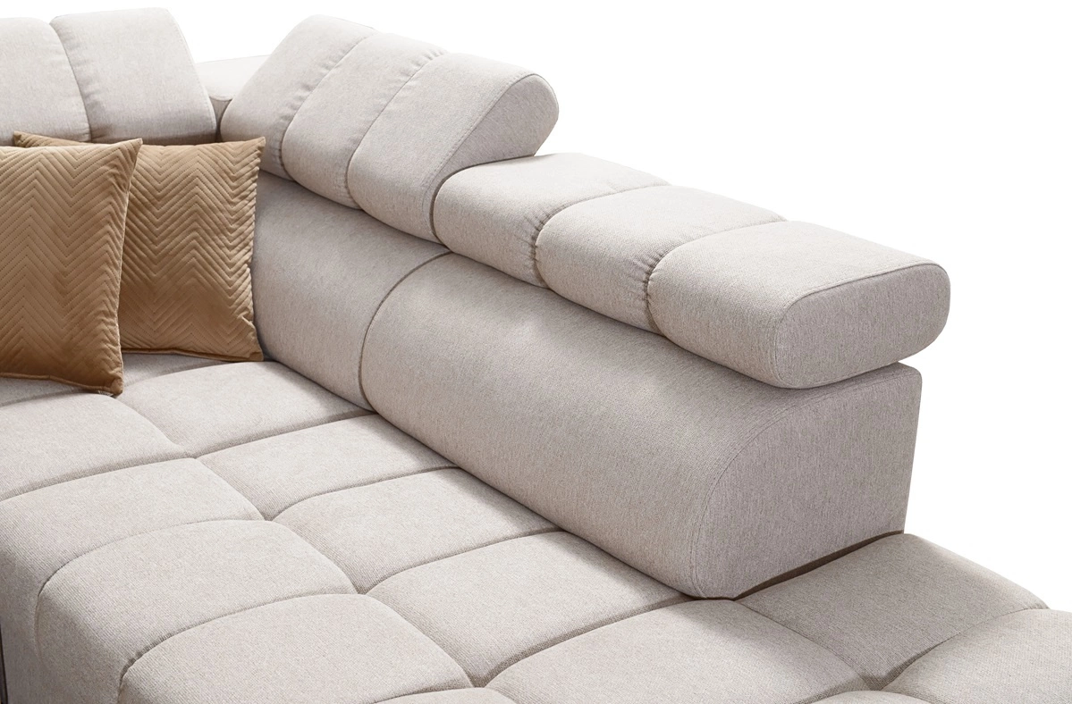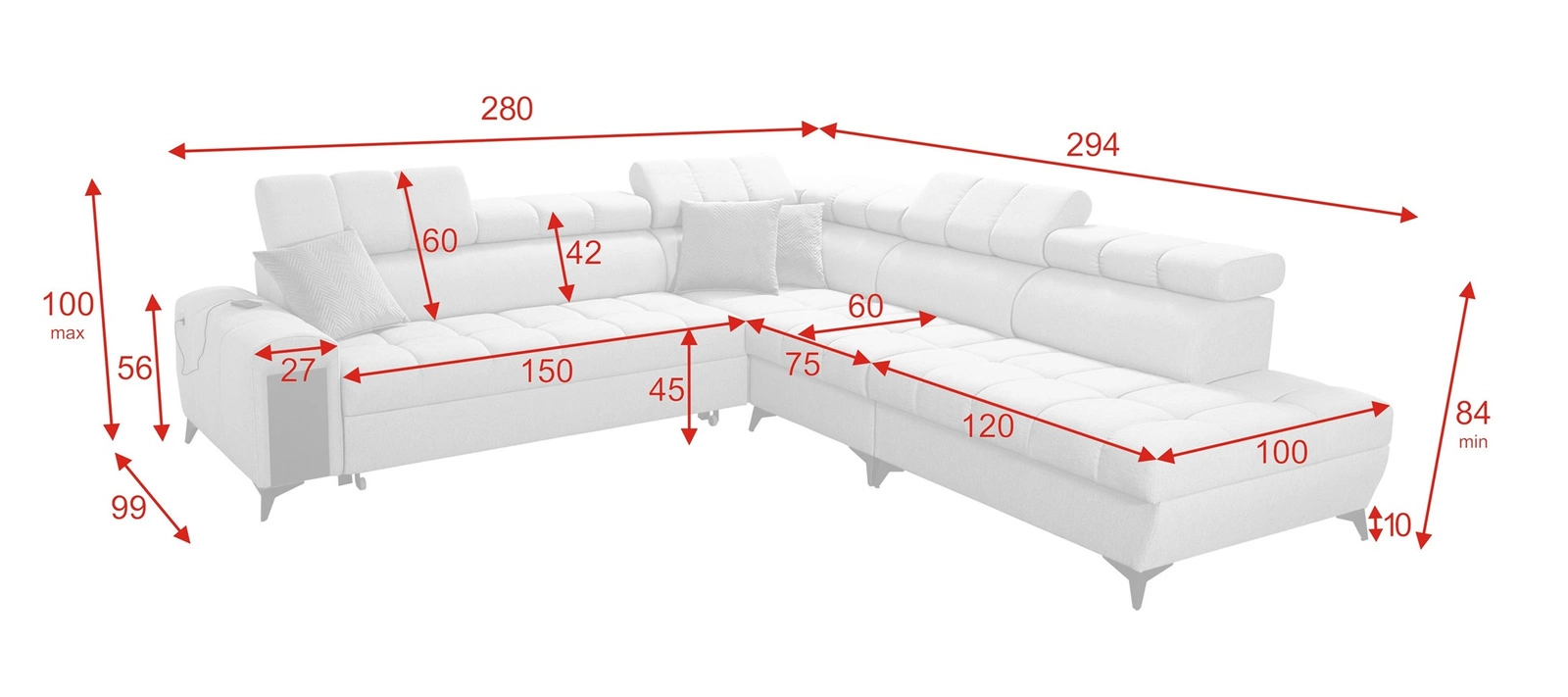 Wymiary mebla pozwolą na zapełnienie przestrzeni w przestronnym salonie lub pokoju dziennym. Szerokość narożnika 280 cm, wysokość maksymalna 100 cm oraz głębokość 294 cm. Powierzchnia spania narożnika wynosi 127x210 cm. Wysokość siedziska mebla to 45 cm a maksymalna wysokość oparcia wynosi 60 cm. Sprężyny faliste oraz pianka poliuretanowa T30 to materiał, z którego wykonane zostało siedzisko narożnika. Oparcie z regulowanymi zagłówkami pozwoli na łatwe dostosowanie kąta nachylenia zagłówków do swoich preferencji oraz daje gwarancję wygodnego wypoczynku po długim dniu, które docenisz Ty, Twoi bliscy a także goście, którzy zasiądą na tym wyjątkowym narożniku.