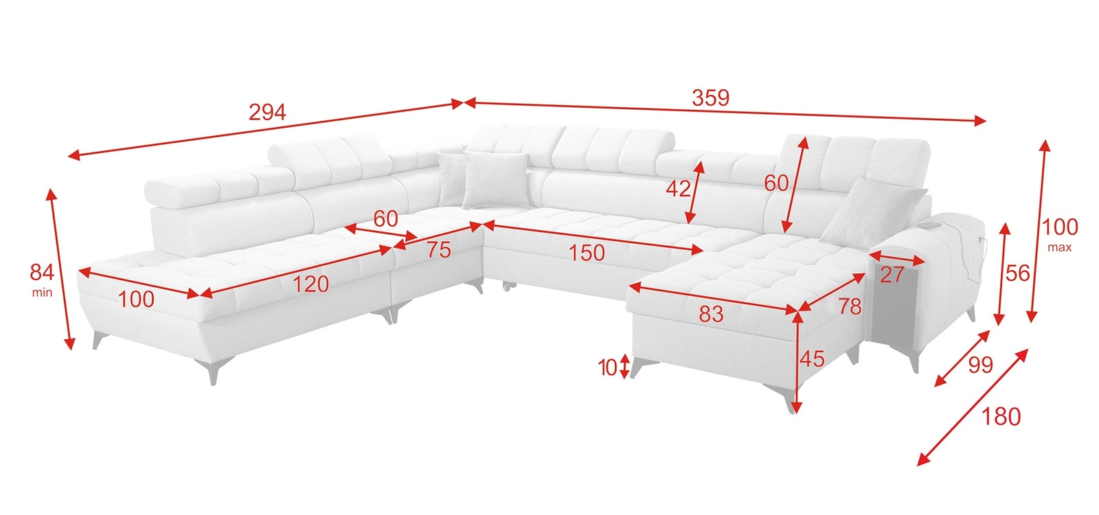Wymiary mebla są optymalne. Szerokość narożnika 359 cm, wysokość maksymalna 100 cm oraz głębokość 294 cm. Powierzchnia spania narożnika wynosi 127x284 cm. Wysokość siedziska mebla to 45 cm a maksymalna wysokość oparcia wynosi 60 cm. Sprężyny faliste oraz pianka poliuretanowa T30 to materiał, z którego wykonane zostało siedzisko narożnika. Oparcie z regulowanymi zagłówkami pozwoli na łatwe dostosowanie kąta nachylenia zagłówków do swoich preferencji oraz daje gwarancję wygodnego wypoczynku po długim dniu, które docenisz Ty, Twoi bliscy a także goście, którzy zasiądą na tym wyjątkowym narożniku.