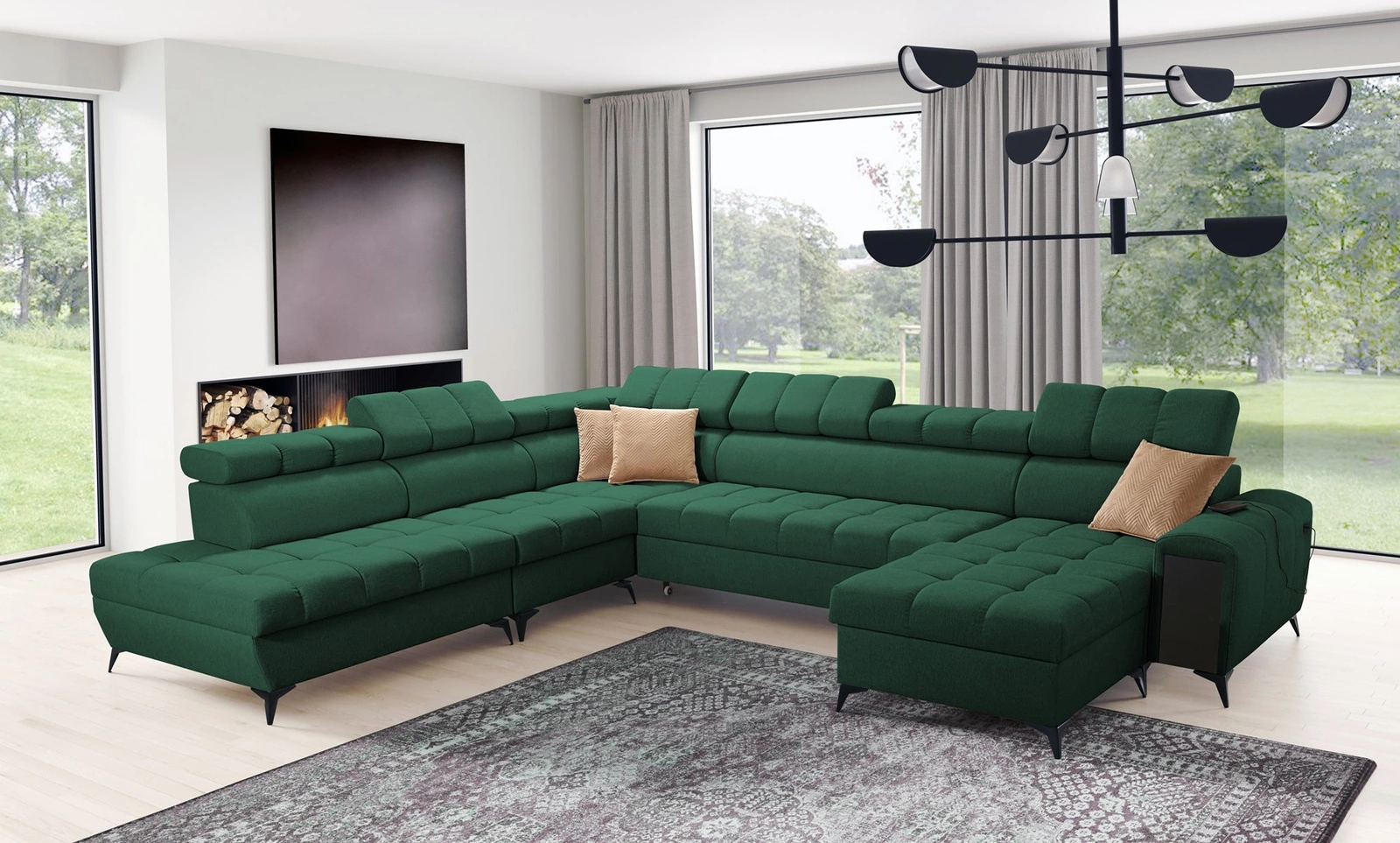 Narożnik Bolmso X w kolorze zielonym z regulowanymi zagłówkami to ciekawie prezentujący się mebel z gwarancją najwyższego komfortu i funkcjonalności.