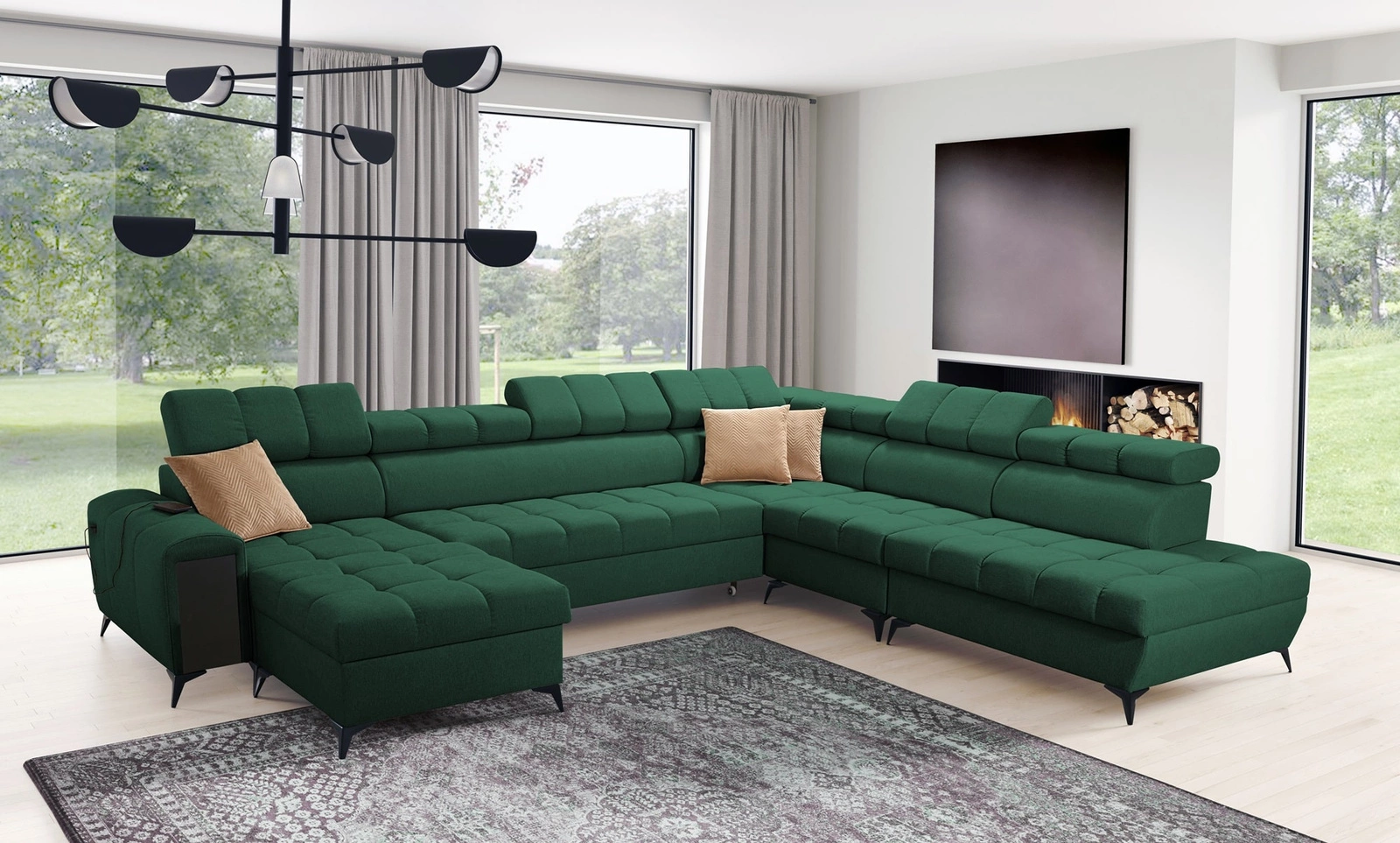 Narożnik Bolmso X w kolorze zielonym z regulowanymi zagłówkami to ciekawie prezentujący się mebel z gwarancją najwyższego komfortu i funkcjonalności.