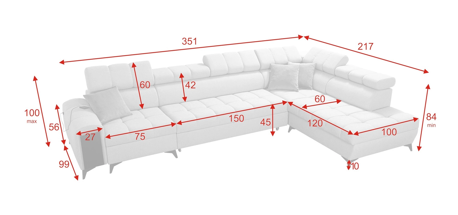 Wymiary mebla pozwolą na zapełnienie przestrzeni w przestronnym salonie lub pokoju dziennym. Szerokość narożnika 351 cm, wysokość maksymalna 100 cm oraz głębokość 217 cm. Powierzchnia spania narożnika wynosi 127x210 cm. Wysokość siedziska mebla to 45 cm a maksymalna wysokość oparcia wynosi 60 cm. Sprężyny faliste oraz pianka poliuretanowa T30 to materiał, z którego wykonane zostało siedzisko narożnika. Oparcie z regulowanymi zagłówkami pozwoli na łatwe dostosowanie kąta nachylenia zagłówków do swoich preferencji oraz daje gwarancję wygodnego wypoczynku po długim dniu, które docenisz Ty, Twoi bliscy a także goście, którzy zasiądą na tym wyjątkowym narożniku.