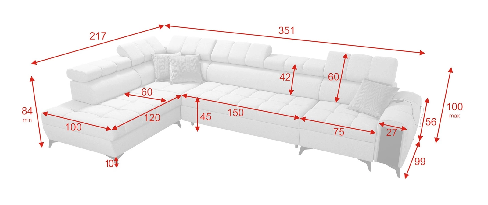 Wymiary mebla pozwolą na zapełnienie przestrzeni w przestronnym salonie lub pokoju dziennym. Szerokość narożnika 351 cm, wysokość maksymalna 100 cm oraz głębokość 217 cm. Powierzchnia spania narożnika wynosi 127x210 cm. Wysokość siedziska mebla to 45 cm a maksymalna wysokość oparcia wynosi 60 cm. Sprężyny faliste oraz pianka poliuretanowa T30 to materiał, z którego wykonane zostało siedzisko narożnika. Oparcie z regulowanymi zagłówkami pozwoli na łatwe dostosowanie kąta nachylenia zagłówków do swoich preferencji oraz daje gwarancję wygodnego wypoczynku po długim dniu, które docenisz Ty, Twoi bliscy a także goście, którzy zasiądą na tym wyjątkowym narożniku.