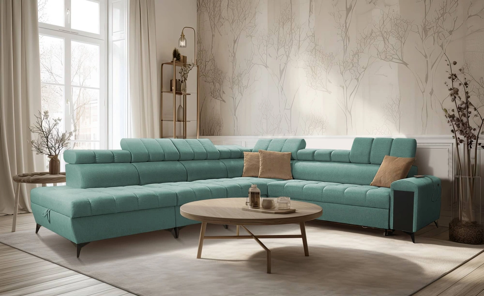 Narożnik Bolmso XII w kolorze miętowym z regulowanymi zagłówkami to zachwycający mebel z gwarancją najwyższego komfortu i funkcjonalności.