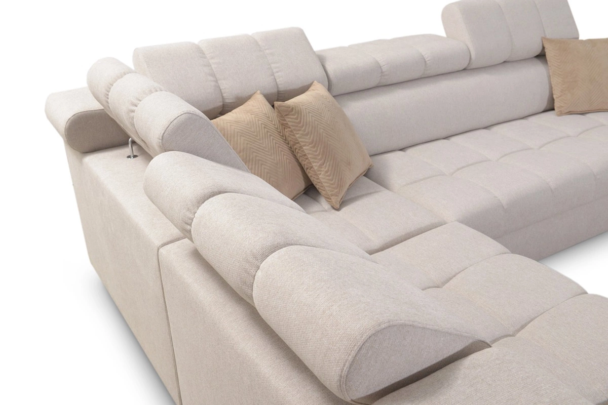 Dodatki tego mebla, które docenią wszyscy użytkownicy to pojemniki na pościel, funkcja spania, gniazdo ładowania USB w boczku narożnika oraz szuflada z systemem pełnego wysuwu w boczku mebla.