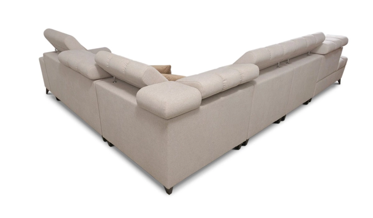 Wymiary mebla pozwolą na zapełnienie przestrzeni w przestronnym salonie lub pokoju dziennym. Szerokość narożnika 276 cm, wysokość maksymalna 100 cm oraz głębokość 369 cm. Powierzchnia spania narożnika wynosi 127x210 cm. Wysokość siedziska mebla to 45 cm a maksymalna wysokość oparcia wynosi 60 cm. Sprężyny faliste oraz pianka poliuretanowa T30 to materiał, z którego wykonane zostało siedzisko narożnika. Oparcie z regulowanymi zagłówkami pozwoli na łatwe dostosowanie kąta nachylenia zagłówków do swoich preferencji oraz daje gwarancję wygodnego wypoczynku po długim dniu, które docenisz Ty, Twoi bliscy a także goście, którzy zasiądą na tym wyjątkowym narożniku.