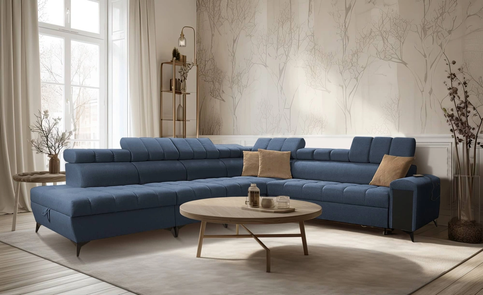 Narożnik Bolmso XII w kolorze niebieskim z regulowanymi zagłówkami to zachwycający mebel z gwarancją najwyższego komfortu i funkcjonalności.
