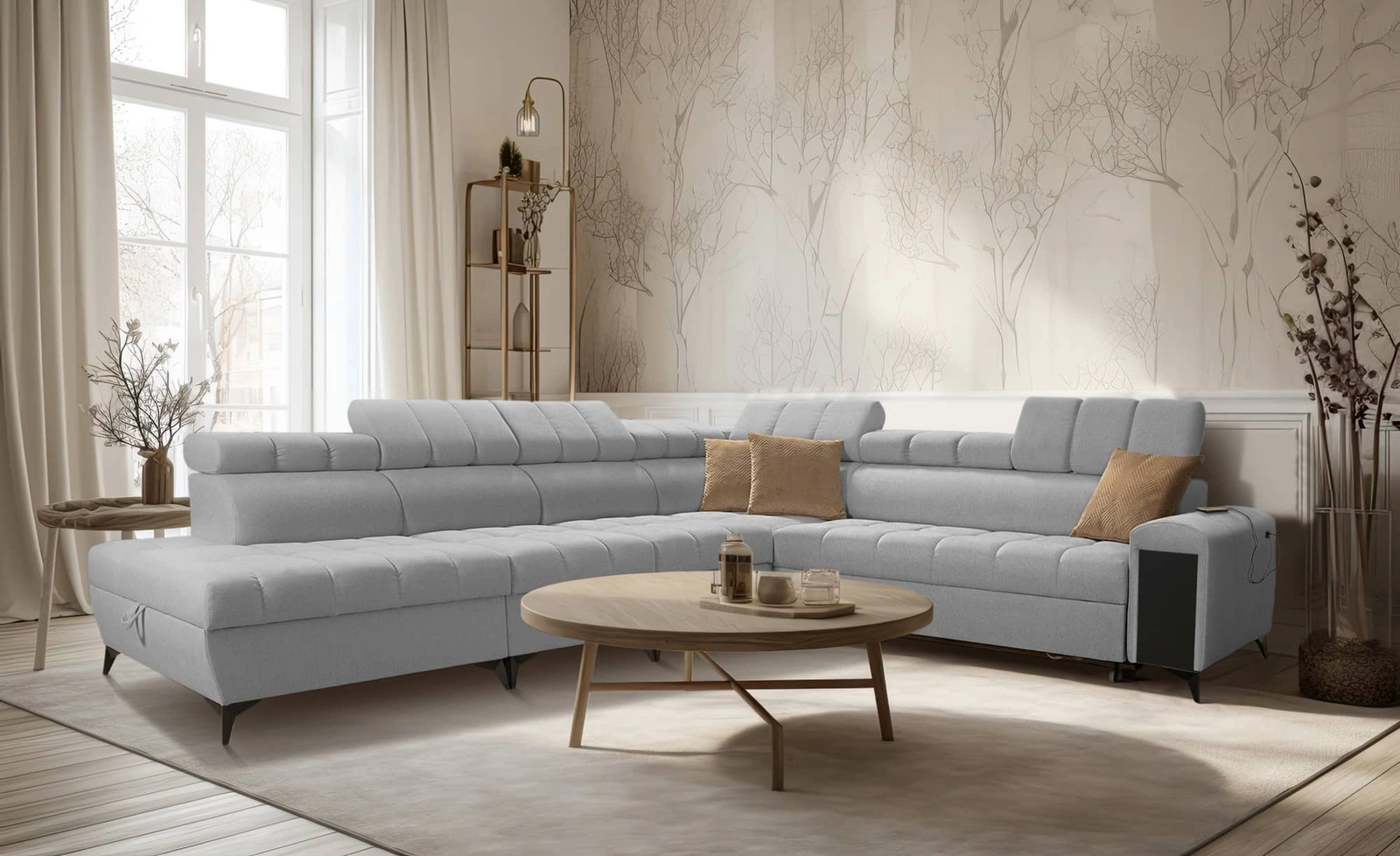 Dodatki tego mebla, które docenią wszyscy użytkownicy to pojemniki na pościel, funkcja spania, gniazdo ładowania USB w boczku narożnika oraz szuflada z systemem pełnego wysuwu w boczku mebla.