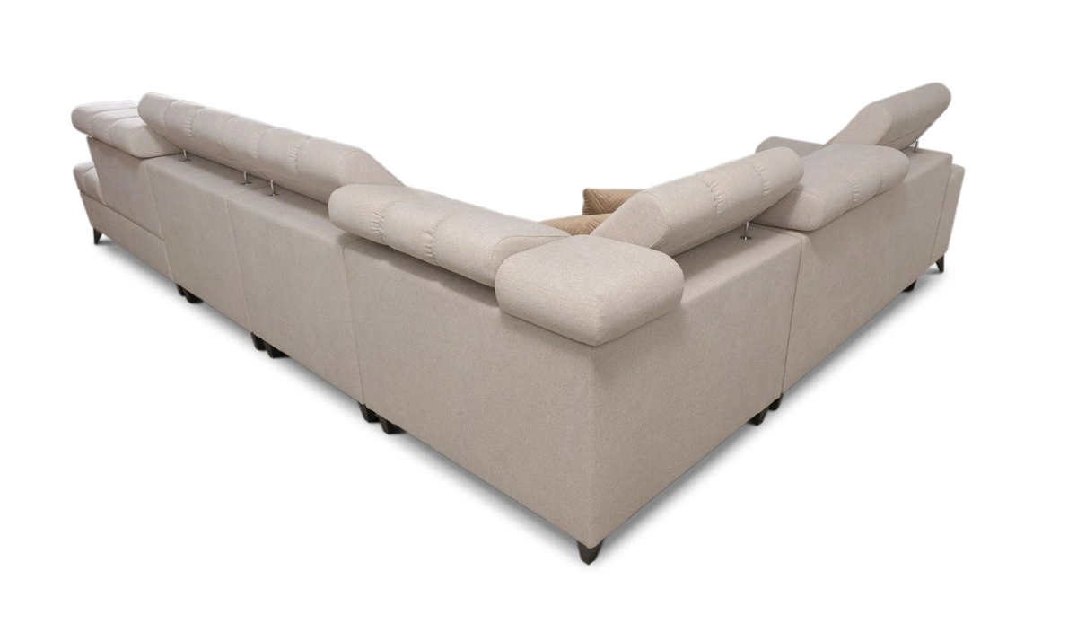 Wymiary mebla pozwolą na zapełnienie przestrzeni w przestronnym salonie lub pokoju dziennym. Szerokość narożnika 276 cm, wysokość maksymalna 100 cm oraz głębokość 369 cm. Powierzchnia spania narożnika wynosi 127x210 cm. Wysokość siedziska mebla to 45 cm a maksymalna wysokość oparcia wynosi 60 cm. Sprężyny faliste oraz pianka poliuretanowa T30 to materiał, z którego wykonane zostało siedzisko narożnika. Oparcie z regulowanymi zagłówkami pozwoli na łatwe dostosowanie kąta nachylenia zagłówków do swoich preferencji oraz daje gwarancję wygodnego wypoczynku po długim dniu, które docenisz Ty, Twoi bliscy a także goście, którzy zasiądą na tym wyjątkowym narożniku.