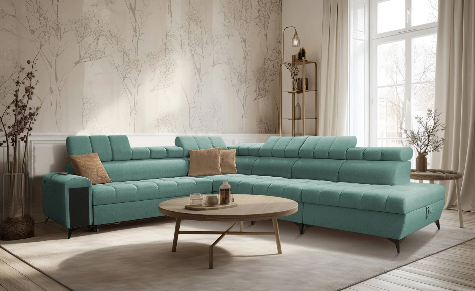 Narożnik Bolmso XII w kolorze miętowym z regulowanymi zagłówkami to zachwycający mebel z gwarancją najwyższego komfortu i funkcjonalności.
