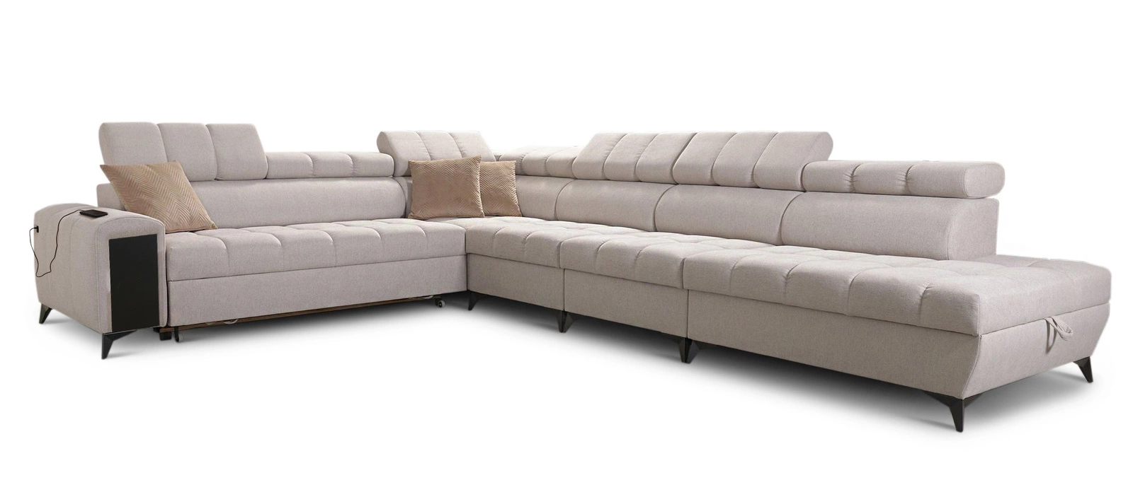 Dodatki tego mebla, które docenią wszyscy użytkownicy to pojemniki na pościel, funkcja spania, gniazdo ładowania USB w boczku narożnika oraz szuflada z systemem pełnego wysuwu w boczku mebla.