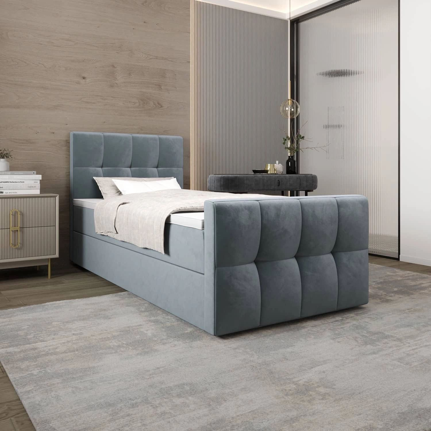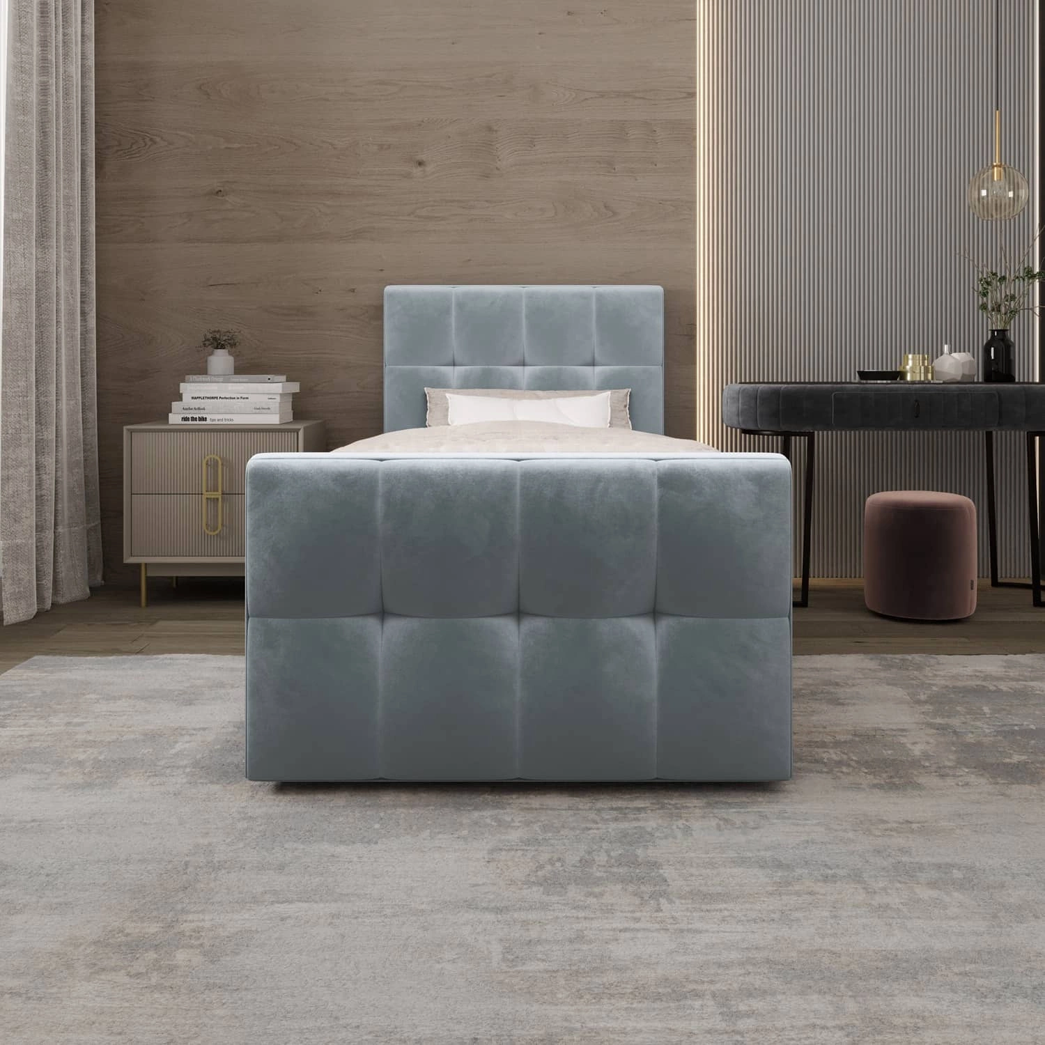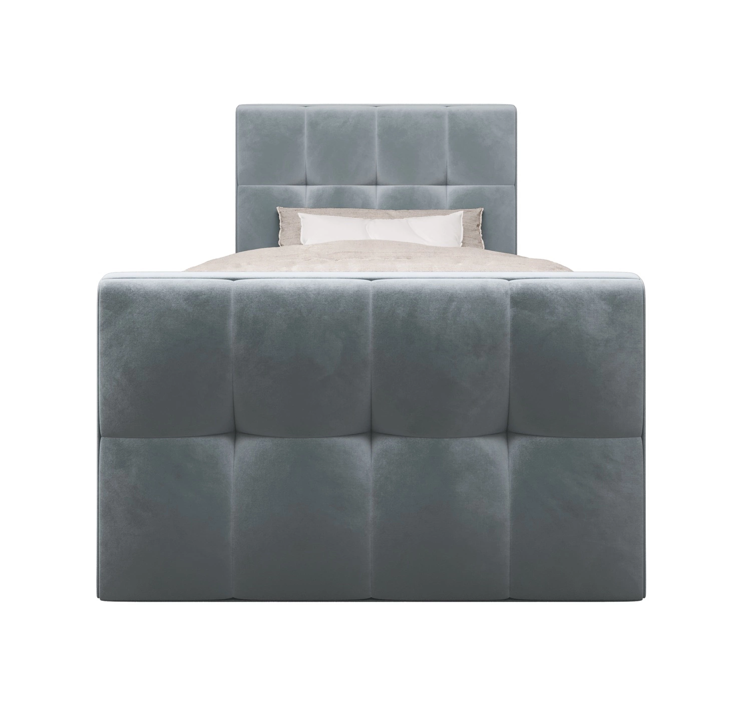 Łóżko wykonane z tkaniny typu velvet Monolith 72 gwarantuje najwyższy komfort i funkcjonalność podczas codziennego wypoczynku w sypialni. Tkanina posiada powłokę hydrofobową, co gwarantuje ograniczone wchłanianie cieczy. Ciekawa struktura tkaniny nadaje wyjątkowego charakteru. Dzięki wszystkim właściwościom użytej tkaniny, łóżko kontynentalne na długo zachowa swój pierwotny wygląd. Konstrukcja łóżka zapewnia dużą stabilność i wygodę użytkowania. Rama łóżka kontynentalnego jest wykonana z drewna oraz płyty meblowej. Pikowane wezgłowie przyciąga wzrok i nadaje łóżku szczególnego charakteru.