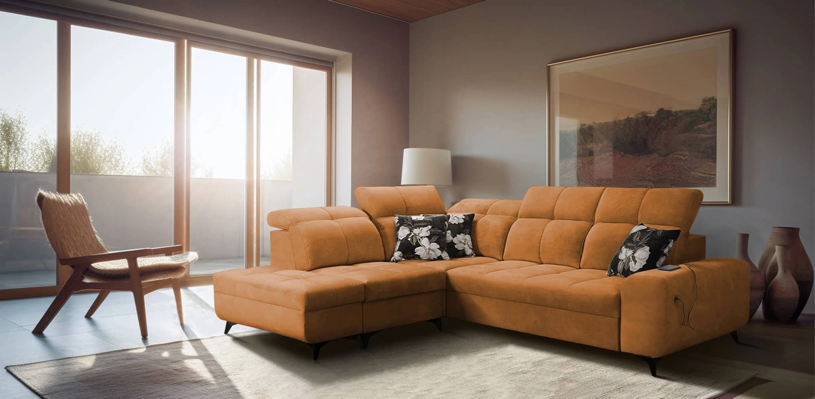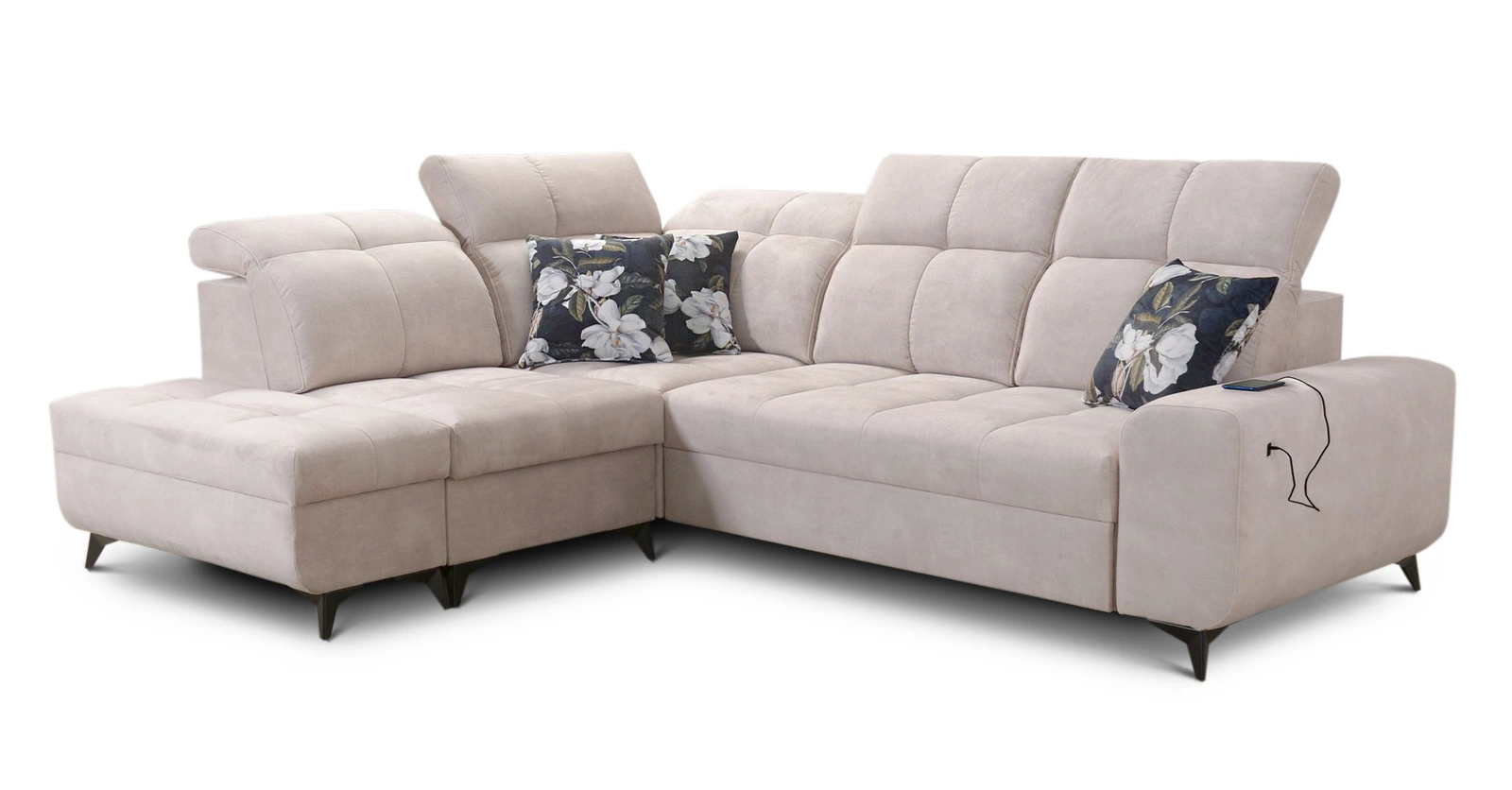 Dodatki tego mebla, które docenią wszyscy użytkownicy to dwa pojemniki na pościel, regulowane zagłówki oraz gniazdo ładowania USB w boczku narożnika.