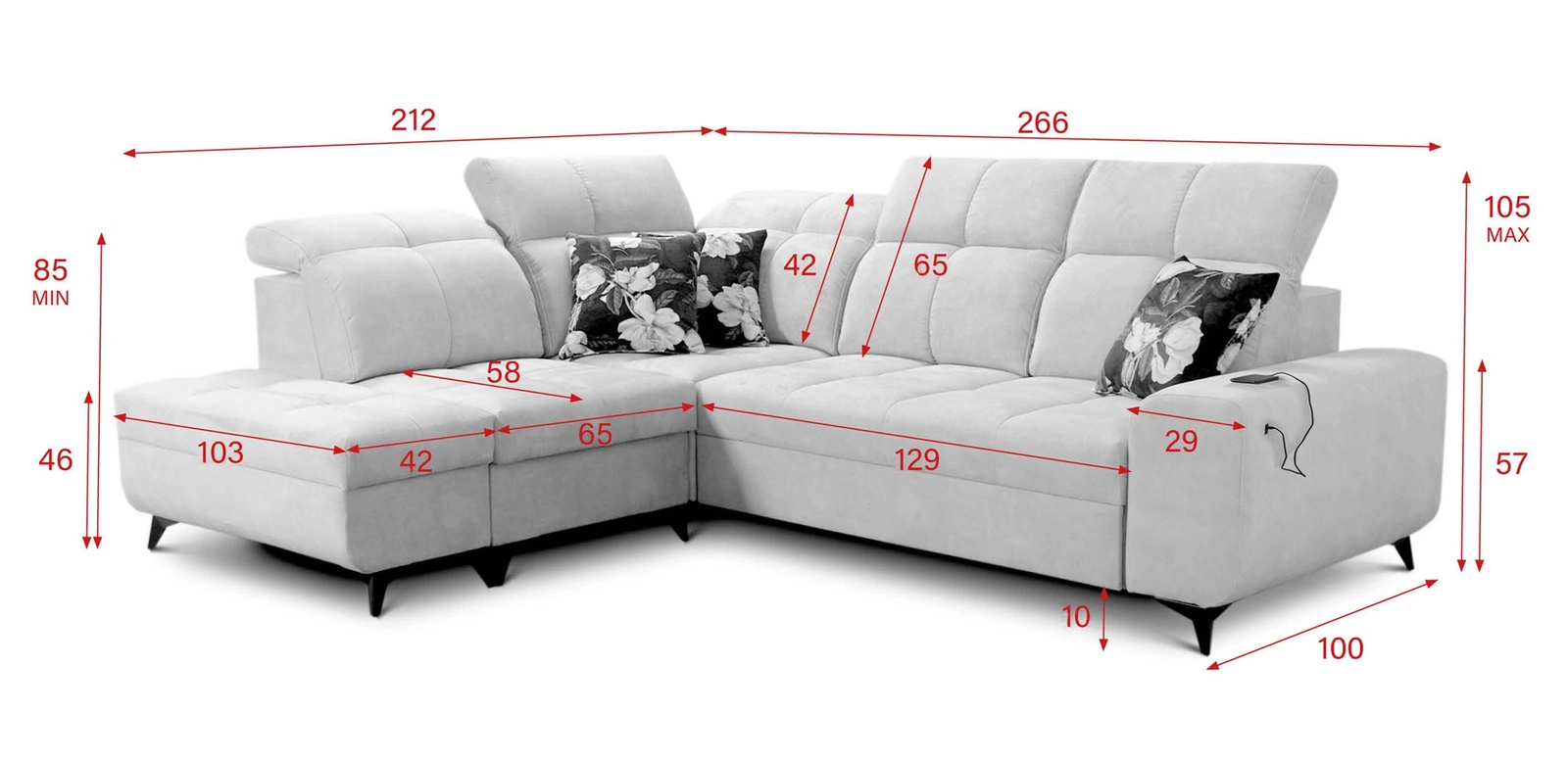 Wymiary mebla pozwolą na zapełnienie przestrzeni w przestronnym salonie lub pokoju dziennym. Szerokość narożnika 266 cm, wysokość maksymalna 105 cm oraz głębokość 212 cm. Powierzchnia spania narożnika wynosi 129x190 cm. Wysokość siedziska mebla to 46 cm a maksymalna wysokość oparcia wynosi 65 cm. Sprężyny faliste oraz pianka poliuretanowa T30 to materiał, z którego wykonane zostało siedzisko narożnika. Oparcie stałe z regulowanymi zagłówkami pozwoli na łatwe dostosowanie kąta nachylenia zagłówków do swoich preferencji oraz daje gwarancję wygodnego wypoczynku po długim dniu, które docenisz Ty, Twoi bliscy a także goście, którzy zasiądą na tym wyjątkowym narożniku.