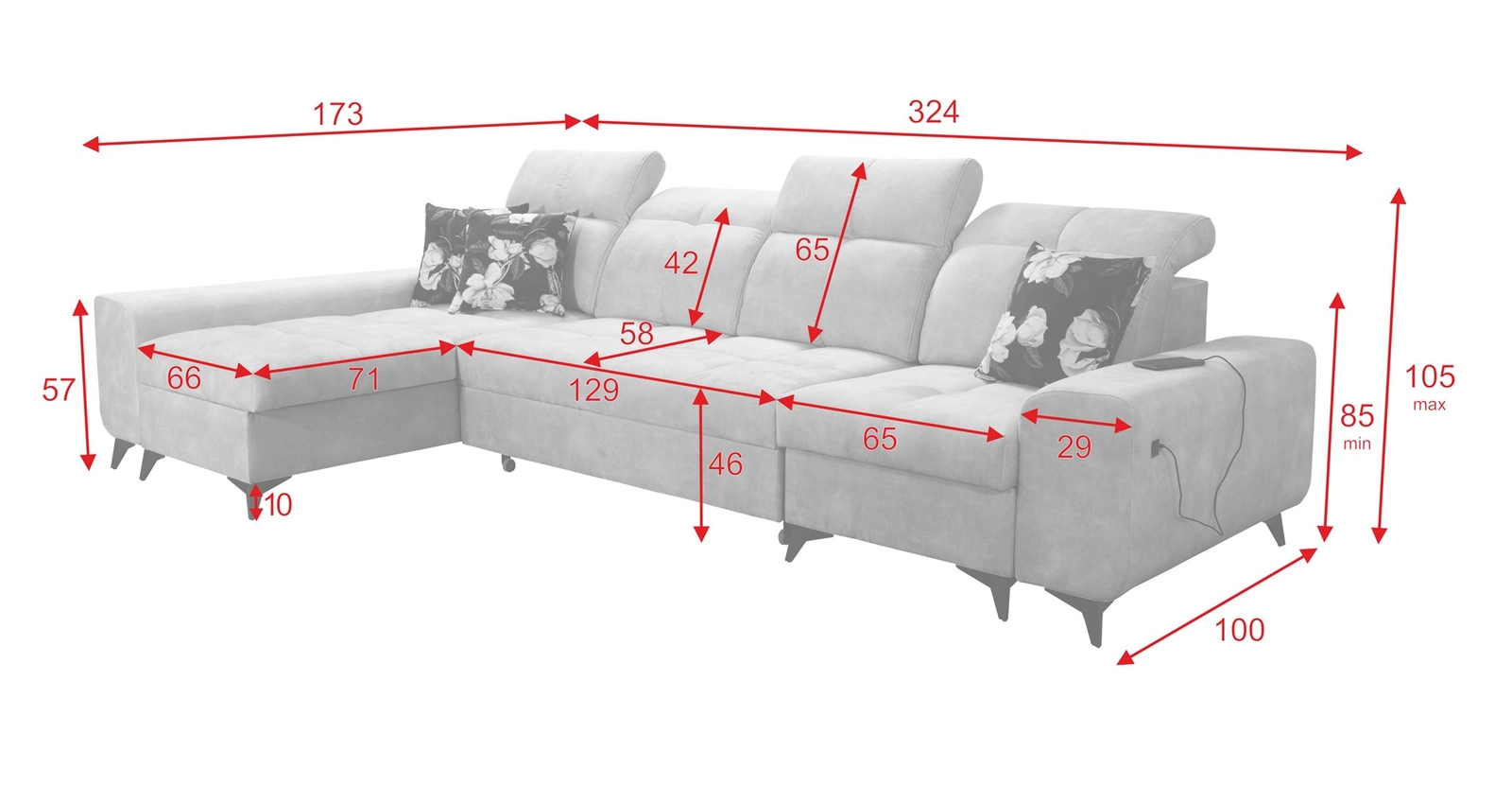 Wymiary mebla pozwolą na zapełnienie przestrzeni w przestronnym salonie lub pokoju dziennym. Szerokość narożnika 324 cm, wysokość maksymalna 105 cm oraz głębokość 173 cm. Powierzchnia spania narożnika wynosi 129x199 cm. Wysokość siedziska mebla to 46 cm a maksymalna wysokość oparcia wynosi 65 cm. Sprężyny faliste oraz pianka poliuretanowa T30 to materiał, z którego wykonane zostało siedzisko narożnika. Oparcie stałe z regulowanymi zagłówkami pozwoli na łatwe dostosowanie kąta nachylenia zagłówków do swoich preferencji oraz daje gwarancję wygodnego wypoczynku po długim dniu, które docenisz Ty, Twoi bliscy a także goście, którzy zasiądą na tym wyjątkowym narożniku.