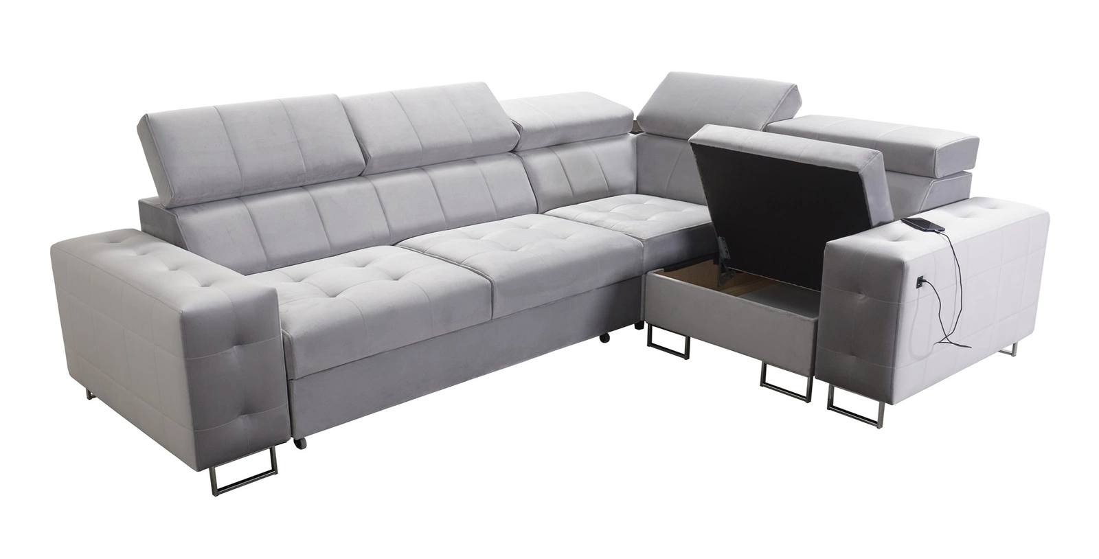 Dodatki tego mebla, które docenią wszyscy użytkownicy to pojemnik na pościel, funkcja spania, regulowane zagłówki oraz gniazdo ładowania USB.