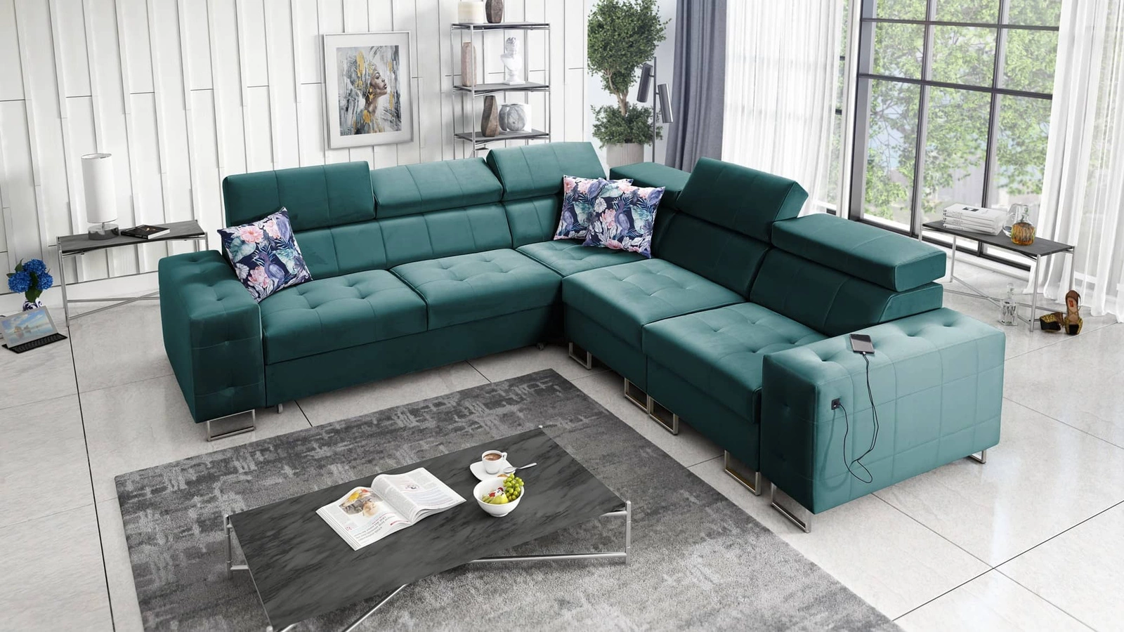Narożnik Hampton III w kolorze morskim z regulowanymi zagłówkami to elegancki mebel, który świetnie dopasuje się do każdej aranżacji w Twoim domu.
