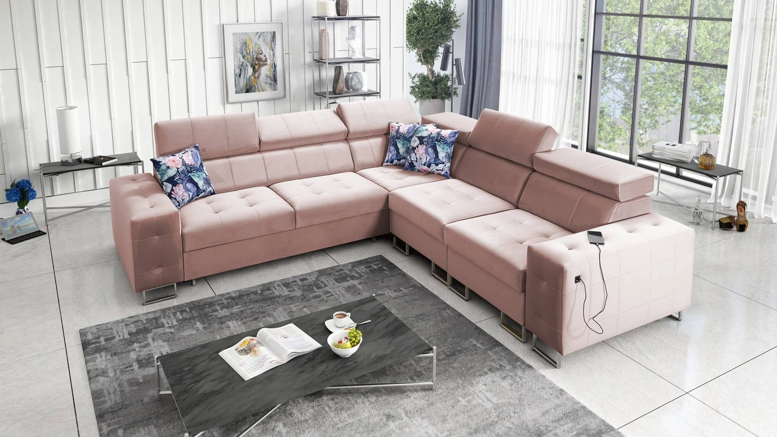 Narożnik Hampton III w kolorze kwarcowy róż z regulowanymi zagłówkami to elegancki mebel, który świetnie dopasuje się do każdej aranżacji w Twoim domu.